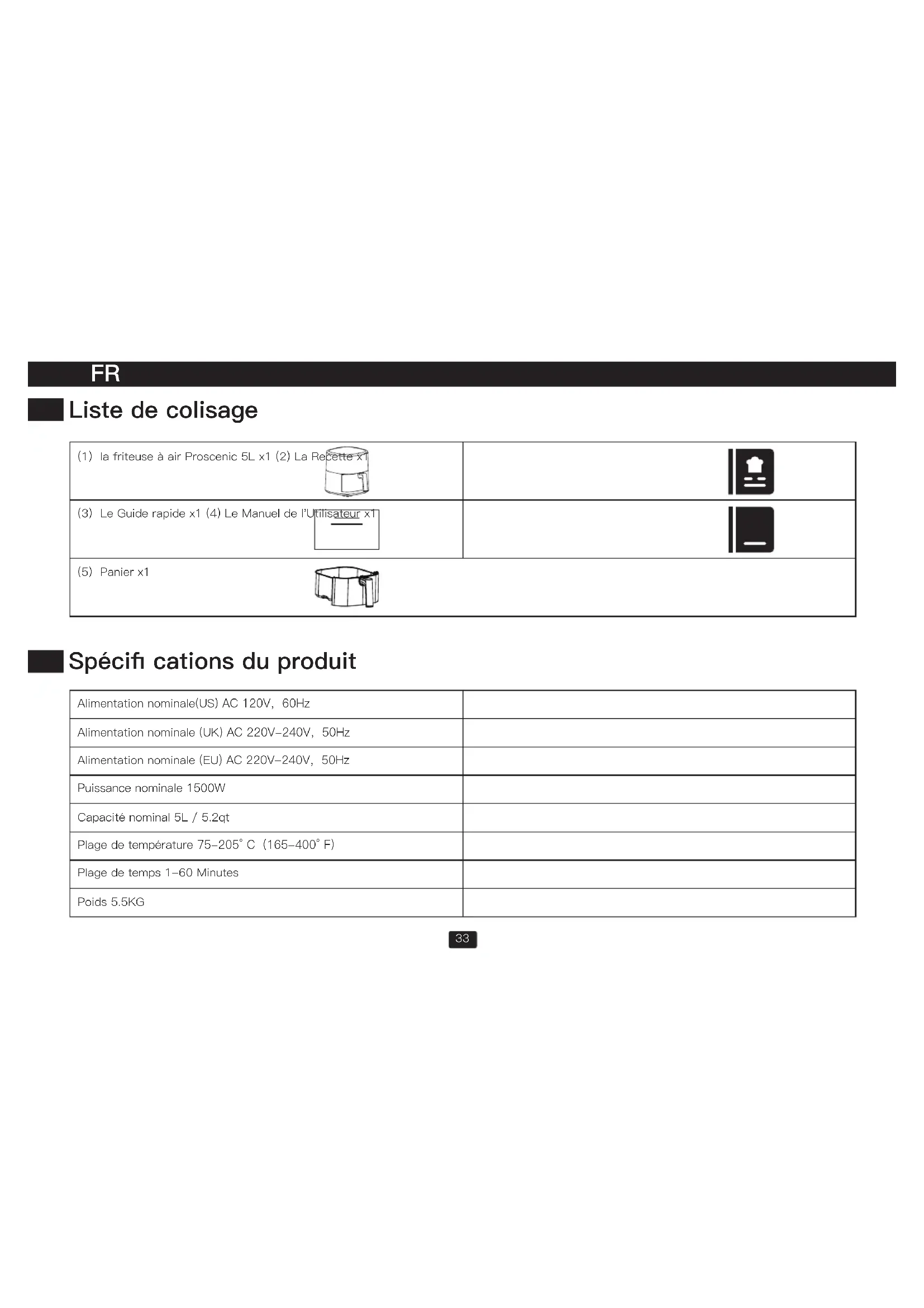 (1) la friteuse à air Proscenic 5L x1 (2) La Recette x1 (3) Le Guide rapide x1 (4) Le Manuel de l'Utilisateur x1 (5) Panier x1 Spécifi cations du produit Alimentation nominale(US) AC 120V,60Hz Alimentation nominale (UK) AC 220V-240V,50Hz Alimentation nominale (EU) AC 220V-240V,50Hz Puissance nominale 1500W Capacité nominal 5L / 5.2qt Plage de température 75-205° C(165-400° F) Plage de temps 1-60 Minutes Poids 5.5KG34 Garantie Attention Avant d'utiliser l'appareil, lisez toutes les instructions et consignes de sécurité et avertissements. Le non-respect de ces mesures de sécurité et instructions peut entraîner des blessures corporelles ou des dommages matériels. Il existe un risque de choc électrique. Vérifi ez si la tension de votre maison correspond à la tension de l'appareil électrique et utilisez une prise mise à la terre. N'utilisez pas d'adaptateurs ni de rallonges. Afi n d’éviter un risque d'incendie, retirez tous les emballages de la friteuse à air, y compris toutes les étiquettes temporaires. Afi n d’éviter un risque d'incendie, retirez tous les emballages de la friteuse à air, y compris toutes les étiquettes temporaires. Sécurité et précautions 1.Placez la friteuse à air dans un environnement seche. Ce produit est destiné à un usage domestique uniquement, n'utilisez pas ce produit à l'extérieur de la maison. 2.Afi n d'éviter que les vapeurs d'huile ne salissent les meubles et aussi éviter les incendies causés par l’accumulation de chaleur pendant le fonctionnement, veuillez garder une certaine distance les murs et les meubles. 3.Veuillez placer la friteuse à air sur une surface plane avec isolation thermique. Gardez la friteuse à air au moins 10 cm ou 4 pouces du mur et de la surface pour assurer la circulation de l'air.