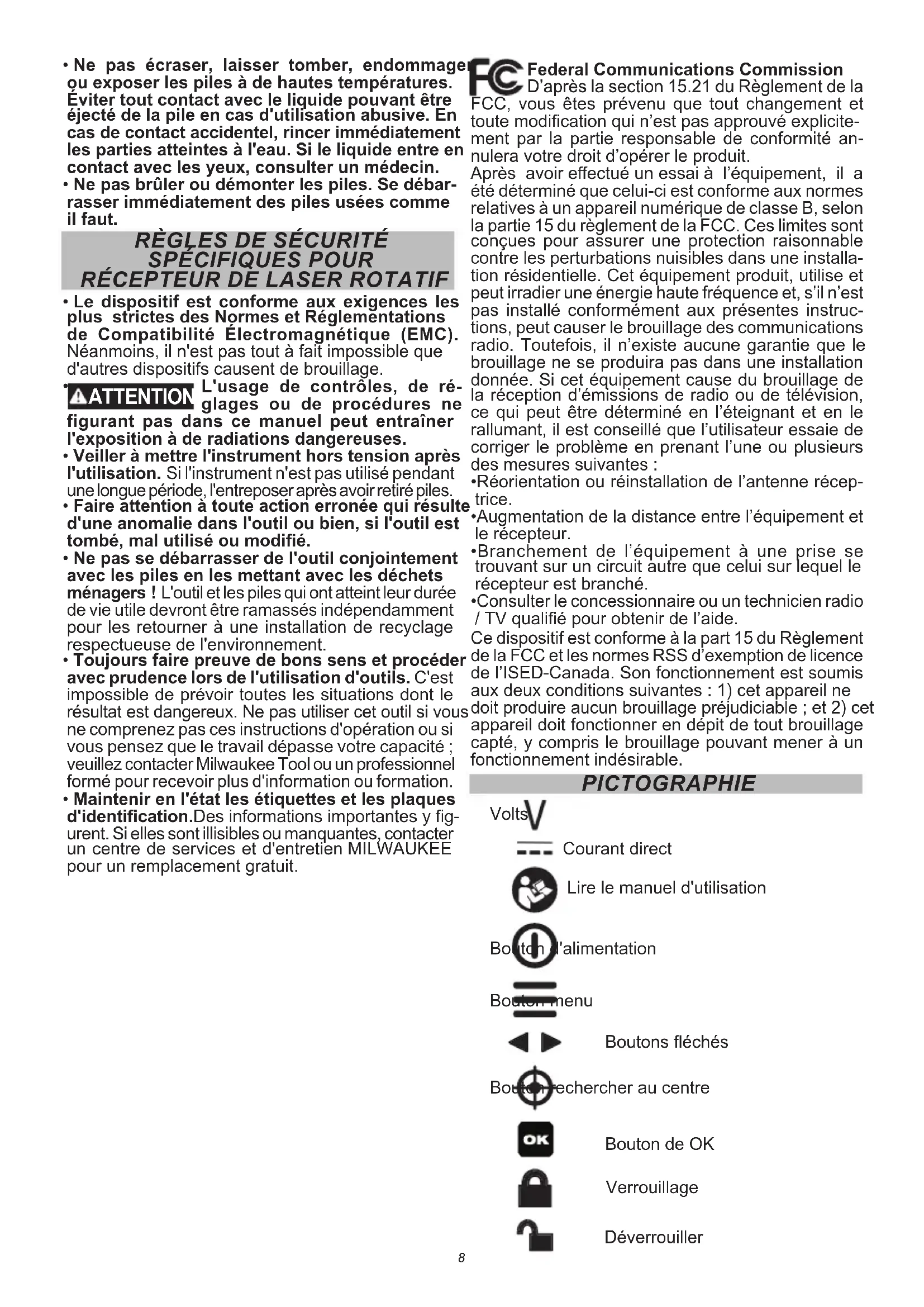 puis tournez le loquet dans le sens inverse des aiguilles d'une montre en position verrouillée. Voyant d'autonomie Pour contrôler l'autonomie restante des piles, allumer l'outil. La charge des piles sera achée sur l'écran : pleine, 3/4, 1/2 et avertissement de charge faible. L'autonomie des piles pourra varier d'une marque/temps d'utilisation à l'autre. Rem- placer les piles dès que possible. UTILISATION AVERTISSEMENT An de minimiser le risque de blessures ou d'eets temporaires sur la vision, ne pas regarder directe- ment dans le laser lorsqu'il est allumé. ATTENTION L'usage de contrôles, de ré- glages ou de procédures ne figurant pas dans ce manuel peut entraîner l'exposition à des rayonnements dangereux. AVIS Eectuer la procédure de vérication de précision sur champ immédiatement après avoir déballé tout nouveau récepteur / télécom- mande et avant d'exposer tel nouveau récepteur / télécommande aux conditions du chantier. Pour de plus amples renseignements, consulter la section « Vérication de précision sur champ ». Si jamais une anomalie est trouvée concernant l'ecacité listée du produit, veuillez contacter un centre de service de MILWAUKEE. Ne pas le faire pourra entraîner le rejet de la réclamation de la ga- rantie. Mise en marche / arrêt du récepteur