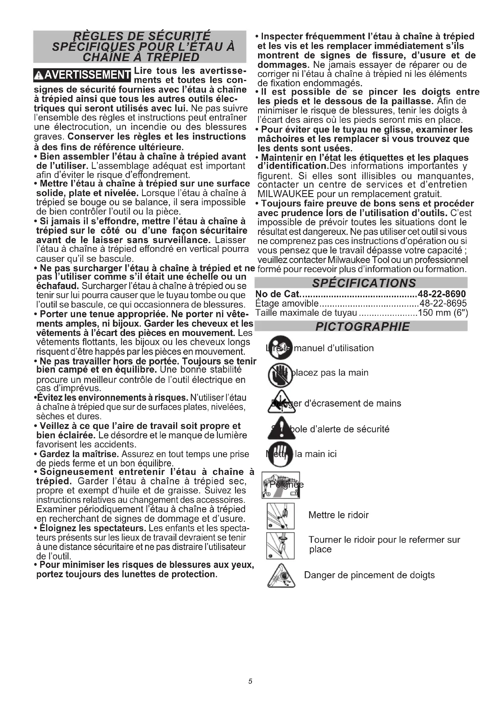- Toujours faire preuve de bons sens et procéder avec prudence lors de l’utilisation d’outils. C’est impossible de prévoir toutes les situations dont le résultat est dangereux. Ne pas utiliser cet outil si vous ne comprenez pas ces instructions d’opération ou si vous pensez que le travail dépasse votre capacité ; veuillez contacter Milwaukee Tool ou un professionnel formé pour recevoir plus d’information ou formation. SPÉCIFICATIONS No de Cat. ............................................ 48-22-8690 Étage amovible ....................................... 48-22-8695 Taille maximale de tuyau .......................150 mm (6") PICTOGRAPHIE Lire le manuel d’utilisation Ne placez pas la main Danger d'écrasement de mains Symbole d’alerte de sécurité Mettre la main ici Poignée