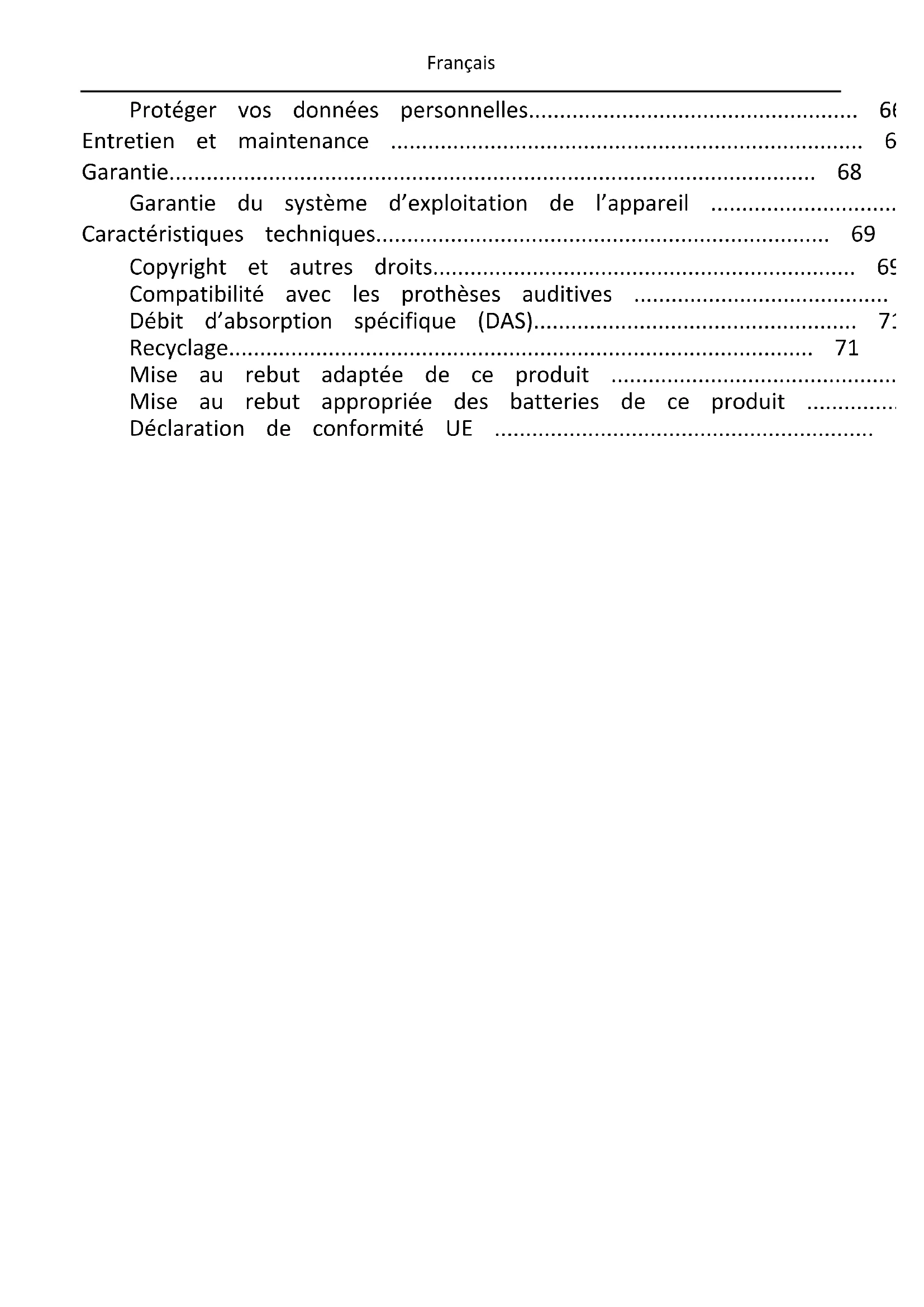 - doivent tenir l’appareil sans fil contre l’oreille se trouvant à l’opposé du dispositif médical. Si vous pensez qu’une interférence est susceptible de se produire, éteignez immédiate- ment l’appareil. Pour toute question concernant l’utilisation de votre appareil sans fil avec un dispositif médical implanté, consultez votre professionnel de santé. Environnements potentiellement explosifs Éteignez votre téléphone dans des zones où l’atmosphère présente des risques d’explo- sion. Respectez tous les panneaux et les instructions. Il s’agit notamment des zones où il est généralement recommandé d’arrêter le moteur de votre véhicule. Dans ces zones, des étincelles peuvent provoquer une explosion ou un incendie, causant des blessures corpo- relles graves, voire mortelles. Éteignez votre appareil dans les stations-service et dans les endroits où des pompes à es- sence et des équipements de réparation automobile sont présents. Observez strictement les restrictions d’utilisation d’équipements de transmission par si- gnaux radioélectriques dans les dépôts de carburant, les zones de stockage et de distribu- tion, les usines chimiques ou dans les endroits où sont utilisés des explosifs. Les zones où l’atmosphère est potentiellement explosive sont souvent, mais pas toujours, signalées clairement. Il s’agit notamment de la zone située en dessous du pont des ba- teaux, des installations destinées au transfert ou au stockage de produits chimiques, des véhicules utilisant des gaz (tels que le propane ou le butane) et des zones dont l’air contient des produits chimiques ou des particules, comme du grain, de la poussière ou des poudres métalliques. Batterie lithium-ion Ce produit contient une batterie lithium-ion. Toute manipulation inadaptée de la batterie peut entraîner un risque de brûlures et d’incendie. AVERTISSEMENT Il existe un risque d’explosion si la batterie n’est pas correctement repositionnée. Pour éviter tout risque de brûlures ou d’incendie, ne tentez jamais de démonter, d’écraser ou de perforer la batterie, ne court-circuitez pas les contacts externes, ne l’exposez pas à des températures supérieures à 60 °C (140 °F) et ne la jetez pas dans le feu ou dans l’eau. N’utilisez jamais une batterie endommagée ou gonflée. Apportez-la à un point de service ou à votre revendeur pour la faire vérifier avant de continuer à l’utiliser. Une batterie endommagée ou gonflée peut présenter un risque d’incendie, d’explosion ou de fuite, ou tout autre risque. Recyclez ou jetez les batteries usagées conformément aux réglementations locales ou au guide de référence fourni avec votre produit. Entretien/Économie de batterie La durée de vie de la batterie peut être réduite si vous continuez à charger votre appareil à 100 %. Activez cette fonction pour prolonger la durée de vie de votre batterie. 64Français Protéger votre ouïe Cet appareil a été soumis à des essais qui ont démontré sa conformité aux exigences de niveau de pression acoustique définies dans les normes EN 50332-1 et/ou EN 50332-2 en vigueur. AVERTISSEMENT Une exposition excessive à des sons forts peut endommager votre ouïe. Une exposition à des sons forts pendant que vous conduisez peut distraire votre attention et provoquer un accident. Écoutez la musique avec un casque à un niveau sonore modéré et ne placez pas l’appareil près de votre oreille lorsque vous utilisez le haut-parleur. Appels d’urgence IMPORTANT Les téléphones mobiles utilisent des signaux radioélectriques, un réseau de téléphonie mobile, un réseau terrestre et des fonctions programmées par l’usager. Ce qui signifie que la connexion ne peut pas être garantie en tout temps. C’est pourquoi il ne faut jamais se fier à un téléphone mobile pour les appels très importants, tels qu’en cas d’urgences médicales. Véhicules Il vous incombe de conduire votre véhicule en toute sécurité. N’utilisez jamais votre appa- reil portatif en conduisant, si la loi l’interdit. Si vous devez passer ou répondre à un appel, arrêtez d’abord votre véhicule dans un en- droit sûr. Les signaux radioélectriques peuvent affecter les systèmes électroniques mal installés ou insuffisamment protégés dans les véhicules motorisés, tels que les systèmes d’injection électronique, de freinage ABS, de régulation de vitesse ou d’airbags. Pour obtenir plus d’informations sur votre véhicule ou tout équipement supplémentaire, consultez le fabri- cant ou son représentant. Ne stockez pas ou ne transportez pas de liquides inflammables, de gaz ou de matériaux explosifs dans le même compartiment que l’appareil ou ses accessoires. Pour les véhicules équipés d’airbags : n’oubliez pas qu’un airbag se gonfle avec beaucoup de puissance. Ne placez aucun objet, y compris des équipements de transmission sans fil intégrés ou portatifs, dans la zone située au-dessus de l’airbag ou dans sa zone de déploiement. Si des équipements de transmission sans fil intégrés au véhicule sont mal installés et si l’airbag se déploie, ceci peut engendrer de graves blessures. L’utilisation de votre appareil est interdite en avion. Éteignez-le avant de monter à bord. L’utilisation d’appareils sans fil dans un avion peut se révéler dangereuse pour le fonction- nement de l’avion et perturber les télécommunications. Cette utilisation peut également être illégale. 65Français Protéger vos données personnelles Protégez vos données personnelles et empêchez toute fuite ou tout abus d’informations sensibles.