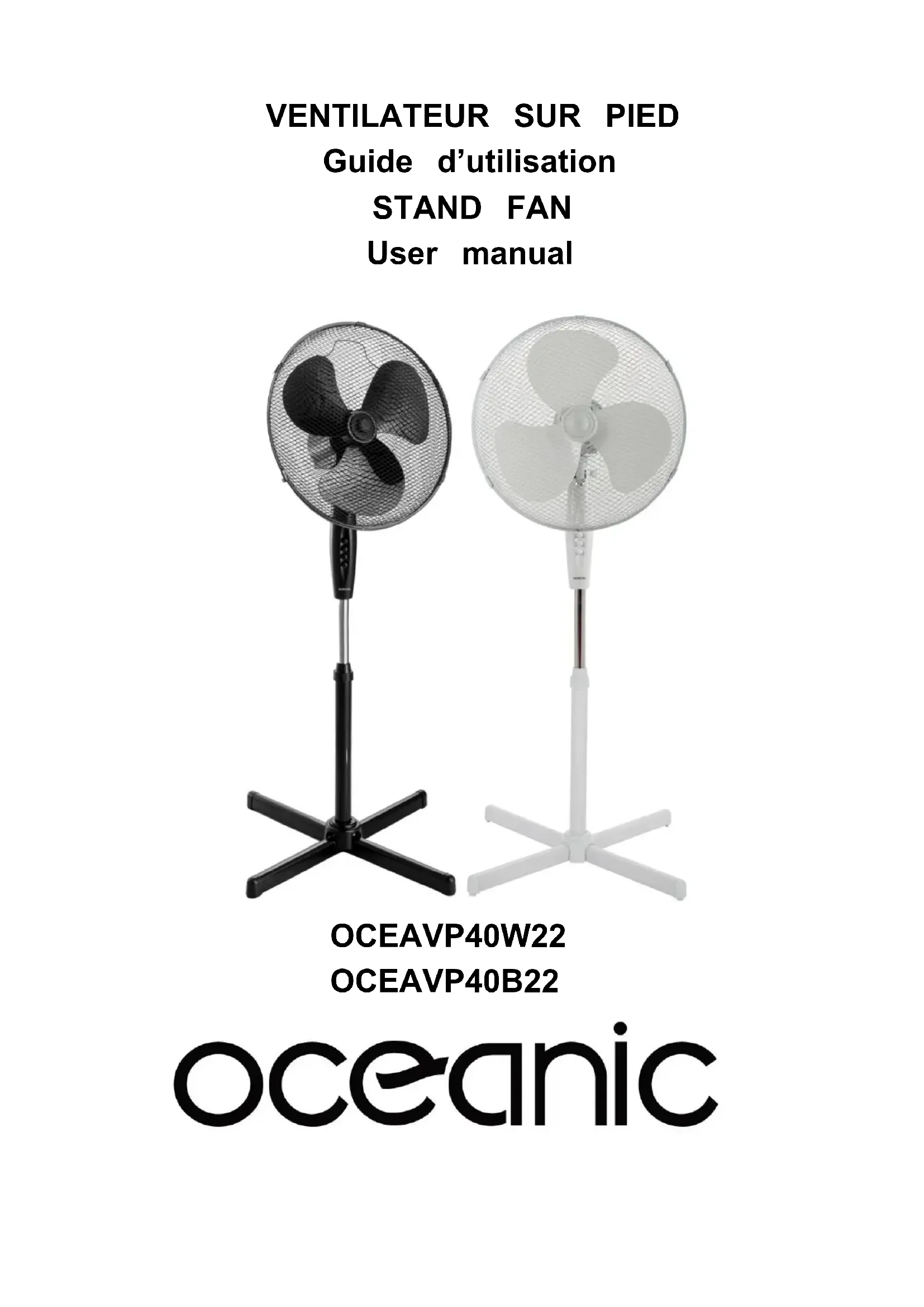 Guide d’utilisation STAND FAN User manual OCEAVP40W22 OCEAVP40B22Consignes de sécurité importantes : Lisez intégralement cette notice d’utilisation avant d’utiliser cet appareil et conservez-la pour consultation ultérieure. Cetappareilestdestinéàunusagedomestique uniquement. Toute utilisation autre que celle prévue pour cet appareil, ou pour une autre application que celle prévue,parexemple une applicationcommerciale, est interdite. Si le cordon d’alimentation est endommagé, il doit être remplacé par le fabricant, un agent de service ou une personne de qualification similaire afin d’éviter un danger.