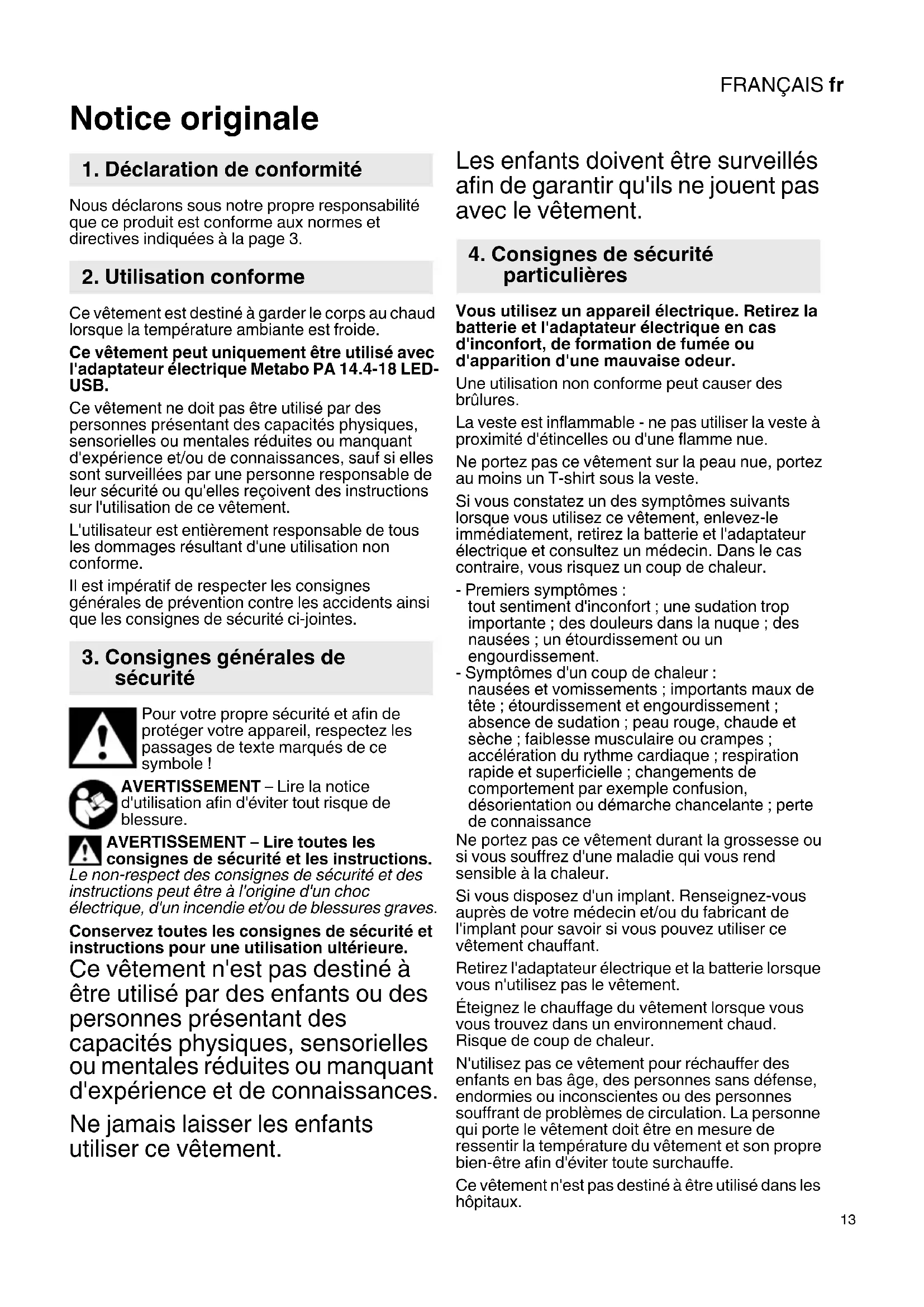 Notice originale Nous déclarons sous notre propre responsabilité que ce produit est conforme aux normes et directives indiquées à la page 3. Ce vêtement est destiné à garder le corps au chaud lorsque la température ambiante est froide. Ce vêtement peut uniquement être utilisé avec l'adaptateur électrique Metabo PA 14.4-18 LED- USB. Ce vêtement ne doit pas être utilisé par des personnes présentant des capacités physiques, sensorielles ou mentales réduites ou manquant d'expérience et/ou de connaissances, sauf si elles sont surveillées par une personne responsable de leur sécurité ou qu'elles reçoivent des instructions sur l'utilisation de ce vêtement. L'utilisateur est entièrement responsable de tous les dommages résultant d'une utilisation non conforme. Il est impératif de respecter les consignes générales de prévention contre les accidents ainsi que les consignes de sécurité ci-jointes. Pour votre propre sécurité et afin de protéger votre appareil, respectez les passages de texte marqués de ce symbole ! AVERTISSEMENT – Lire la notice d'utilisation afin d'éviter tout risque de blessure. AVERTISSEMENT – Lire toutes les consignes de sécurité et les instructions. Le non-respect des consignes de sécurité et des instructions peut être à l'origine d'un choc électrique, d'un incendie et/ou de blessures graves. Conservez toutes les consignes de sécurité et instructions pour une utilisation ultérieure. Ce vêtement n'est pas destiné à être utilisé par des enfants ou des personnes présentant des capacités physiques, sensorielles ou mentales réduites ou manquant d'expérience et de connaissances. Ne jamais laisser les enfants utiliser ce vêtement. Les enfants doivent être surveillés afin de garantir qu'ils ne jouent pas avec le vêtement. Vous utilisez un appareil électrique. Retirez la batterie et l'adaptateur électrique en cas d'inconfort, de formation de fumée ou d'apparition d'une mauvaise odeur. Une utilisation non conforme peut causer des brûlures. La veste est inflammable - ne pas utiliser la veste à proximité d'étincelles ou d'une flamme nue. Ne portez pas ce vêtement sur la peau nue, portez au moins un T-shirt sous la veste. Si vous constatez un des symptômes suivants lorsque vous utilisez ce vêtement, enlevez-le immédiatement, retirez la batterie et l'adaptateur électrique et consultez un médecin. Dans le cas contraire, vous risquez un coup de chaleur. - Premiers symptômes : tout sentiment d'inconfort ; une sudation trop importante ; des douleurs dans la nuque ; des nausées ; un étourdissement ou un engourdissement. - Symptômes d'un coup de chaleur : nausées et vomissements ; importants maux de tête ; étourdissement et engourdissement ; absence de sudation ; peau rouge, chaude et sèche ; faiblesse musculaire ou crampes ; accélération du rythme cardiaque ; respiration rapide et superficielle ; changements de comportement par exemple confusion, désorientation ou démarche chancelante ; perte de connaissance Ne portez pas ce vêtement durant la grossesse ou si vous souffrez d'une maladie qui vous rend sensible à la chaleur. Si vous disposez d'un implant. Renseignez-vous auprès de votre médecin et/ou du fabricant de l'implant pour savoir si vous pouvez utiliser ce vêtement chauffant. Retirez l'adaptateur électrique et la batterie lorsque vous n'utilisez pas le vêtement. Éteignez le chauffage du vêtement lorsque vous vous trouvez dans un environnement chaud. Risque de coup de chaleur. N'utilisez pas ce vêtement pour réchauffer des enfants en bas âge, des personnes sans défense, endormies ou inconscientes ou des personnes souffrant de problèmes de circulation. La personne qui porte le vêtement doit être en mesure de ressentir la température du vêtement et son propre bien-être afin d'éviter toute surchauffe. Ce vêtement n'est pas destiné à être utilisé dans les hôpitaux.