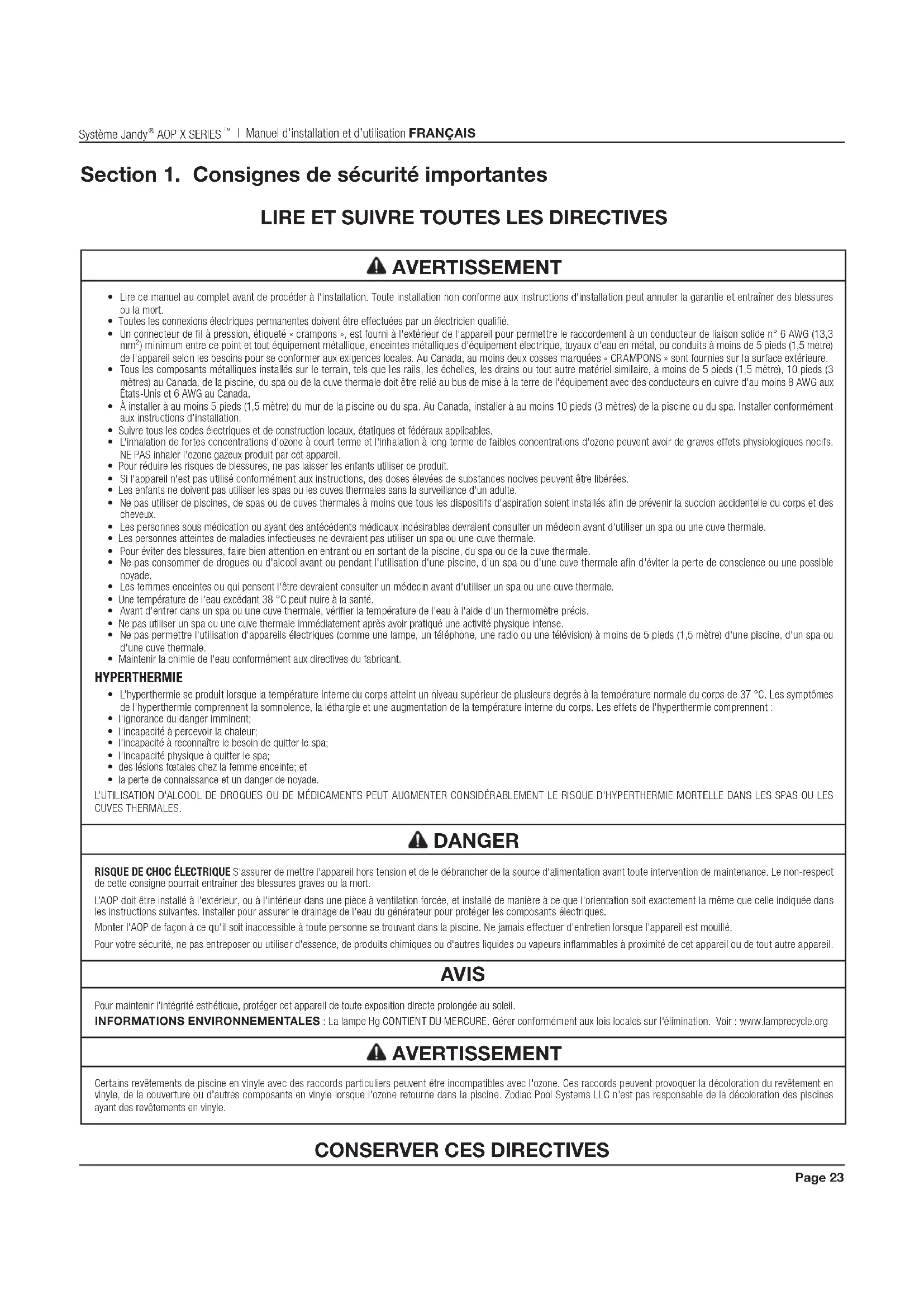 - la perte de connaissance et un danger de noyade. L'UTILISATION D'ALCOOL DE DROGUES OU DE MÉDICAMENTS PEUT AUGMENTER CONSIDÉRABLEMENT LE RISQUE D'HYPERTHERMIE MORTELLE DANS LES SPAS OU LES CUVES THERMALES. DANGER RISQUE DE CHOC ÉLECTRIQUE S'assurer de mettre l'appareil hors tension et de le débrancher de la source d'alimentation avant toute intervention de maintenance. Le non-respect de cette consigne pourrait entraîner des blessures graves ou la mort. L'AOP doit être installé à l'extérieur, ou à l'intérieur dans une pièce à ventilation forcée, et installé de manière à ce que l'orientation soit exactement la même que celle indiquée dans les instructions suivantes. Installer pour assurer le drainage de l'eau du générateur pour protéger les composants électriques. Monter l'AOP de façon à ce qu'il soit inaccessible à toute personne se trouvant dans la piscine. Ne jamais effectuer d'entretien lorsque l'appareil est mouillé. Pour votre sécurité, ne pas entreposer ou utiliser d'essence, de produits chimiques ou d'autres liquides ou vapeurs inflammables à proximité de cet appareil ou de tout autre appareil. AVIS Pour maintenir l'intégrité esthétique, protéger cet appareil de toute exposition directe prolongée au soleil. INFORMATIONS ENVIRONNEMENTALES : La lampe Hg CONTIENT DU MERCURE. Gérer conformément aux lois locales sur l'élimination. Voir : www.lamprecycle.org AVERTISSEMENT Certains revêtements de piscine en vinyle avec des raccords particuliers peuvent être incompatibles avec l'ozone. Ces raccords peuvent provoquer la décoloration du revêtement en vinyle, de la couverture ou d'autres composants en vinyle lorsque l'ozone retourne dans la piscine. Zodiac Pool Systems LLC n'est pas responsable de la décoloration des piscines ayant des revêtements en vinyle. CONSERVER CES DIRECTIVESPage 24 FRANÇAIS Système Jandy