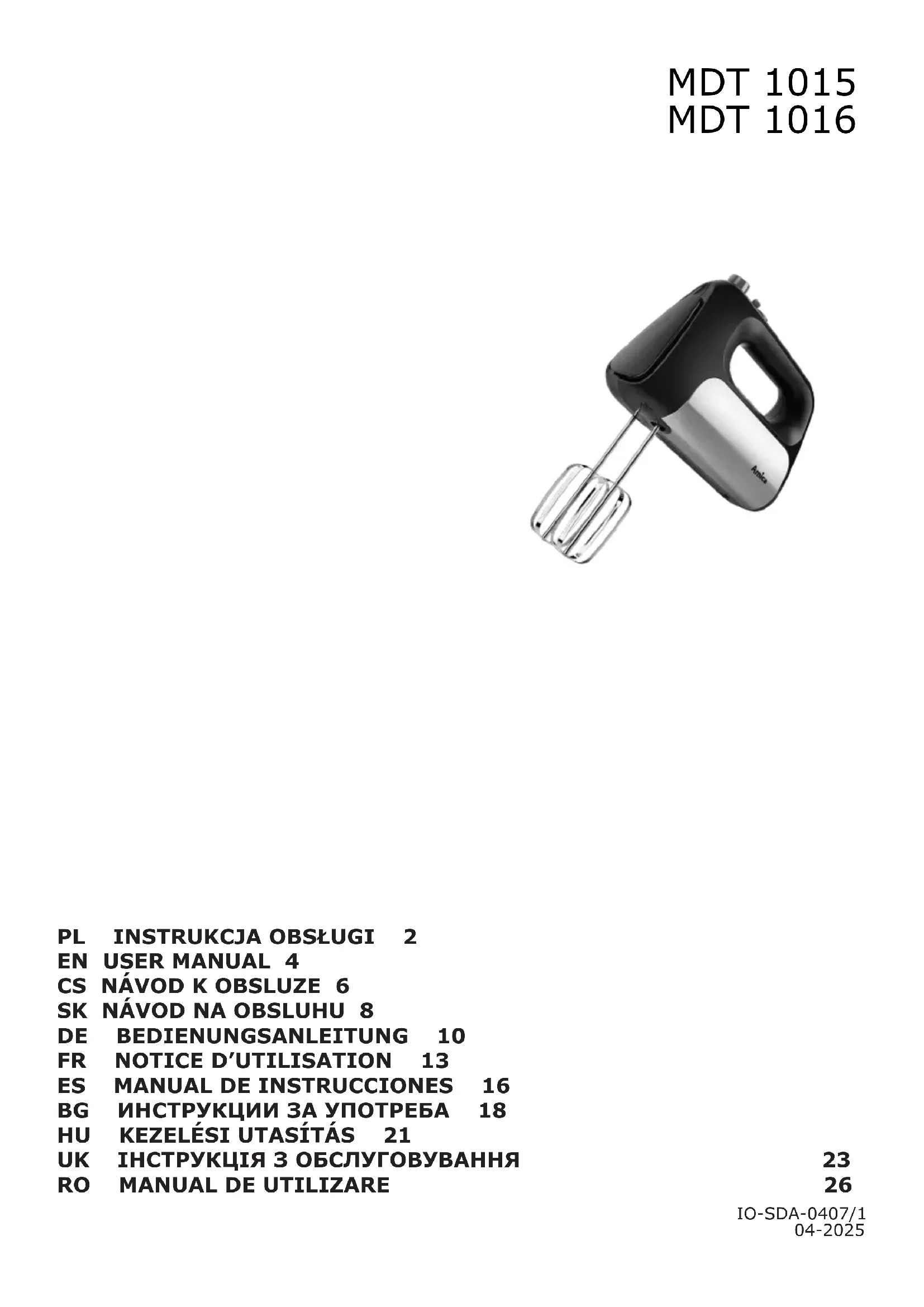 sionner le curseur entre min et max. Pour éteindre le moteur de l’appareil, glisser le curseur sur la posion « 0 ». Pour éteindre com- plètement l’appareil, débrancher le câble d’alimentaon. Ne pas uliser l’appareil avec des aliments qui cuisent. En cas de blocage des éléments qui broient / mélangent, re- rer la che de la prise électrique avant d’enlever les éléments qui bloquent. Faire très aenon. Les éléments de broyage sont très tranchants. Lors du fonconnement de l’appareil ne pas toucher les éléments qui mélangent ou broient, veiller à ce que les cheveux ou les vêtements ne pendent pas. Certains éléments de l’ensemble disposent de lames tranchantes, faire parculièrement aenon en les ulisant. Ne pas dépasser le temps de travail et la quanté de produits indi- qués dans le tableau. Lors de l’ulisaon de l’appareil, uliser uniquement un type d’ac- cessoires, ne pas uliser en même temps d’accessoires aux fonc- ons diérentes. Lors de l’ulisaon des vitesses min et max, ne pas uliser l’appareil plus de 3 minutes, si la foncon turbo est ulisée ne pas dépasser 1 minute de fonconnement. Avant la réulisaon de l’appareil, at- tendre qu’il refroidisse (jusqu’à ce que sa température soit égale à la température ambiante). Lors du fonconnement de l’appareil, ne toucher aucun autre élé- ment que le corps et/ou le bol. Les autres éléments peuvent au cours du fonconnement de l’appareil constuer un danger pour la vie et/ou la santé. L’appareil est conçu pour broyer / mélanger les aliments, ne pas l’uliser à d’autres ns. DONNÉES TECHNIQUES : Paramètres d’alimentaon : AC 220240 V / 50Hz Puissance : 500W Réglage de la vitesse : Oui Foncon Turbo : Oui Fouets : Oui / 2 pcs / Acier inoxydable Mélangeurs : Oui / 2 pcs / Acier inoxydable Câble d’alimentaon : ~1,1m VOTRE APPAREIL :