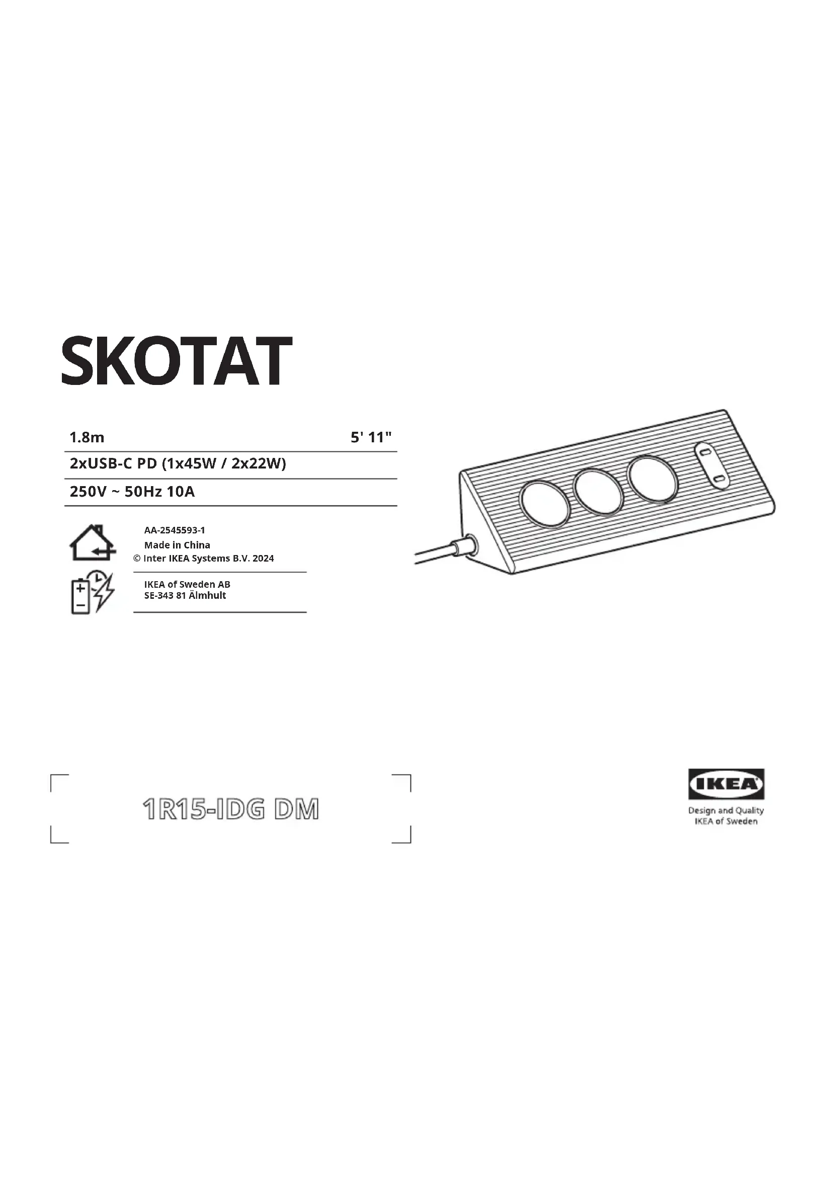 - Débrancher la rallonge de la source d’alimentation lorsque le produit n’est pas utilisé. Fabricant : IKEA of Sweden AB (numéro d'immatriculation : 556074-7551) Adresse: Box 702, SE-343 81 Älmhult, SUÈDE Caractéristiques techniques Modèle: SKOTAT Type: E2308-CH Entrée: 250V ~ 50Hz 10A Max. 2500W Sortie: 250V ~ 50Hz 10A Max. 2500W Puissance de sortie USB-C : UnportUSB-Cen fonctionnement: