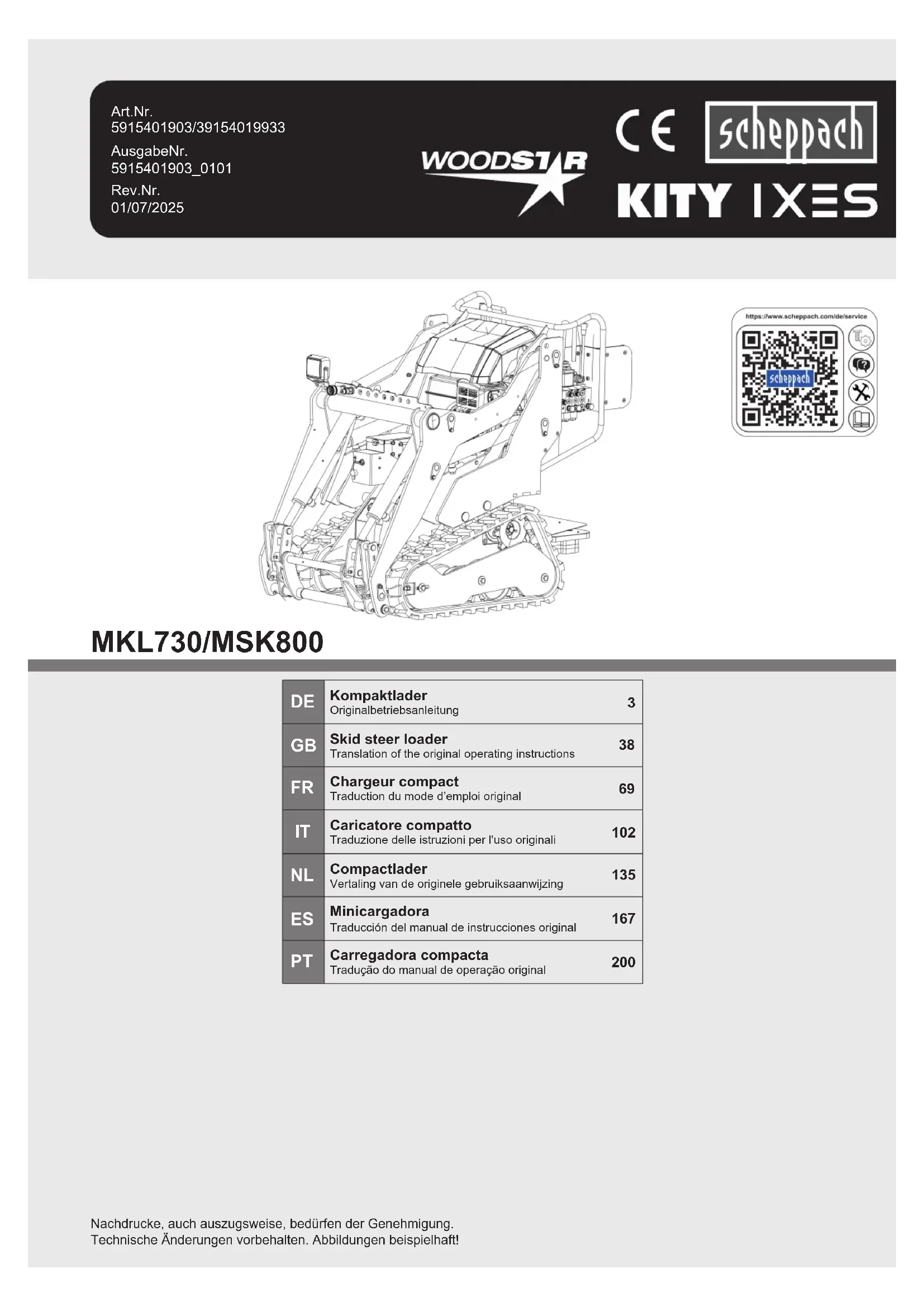 - Les réservoirs de carburant et d’huile vides doivent être éliminés de manière respectueuse de l’environnement. 17 Dépannage Le tableau suivant indique les symptômes d’erreurs et décrit les solutions possibles si votre produit ne fonctionne pas correcte- ment. Si vous n’arrivez pas à localiser et éliminer le problème de cette manière, adressez-vous à l’atelier de service après- vente. Défaut Cause possible Solution Moteur Le produit ne démarre pas. La clé de contact se trouve en position «OFF». Placez la clé de contact en position «ON». Le circuit de la batterie n’est pas fermé. Fermez le circuit au moyen de la clé de sécurité. Le robinet de carburant se trouve en position «OFF». Placez le robinet de carburant en position «ON». Connecteur de bougie d’allu- mage pas raccordé. Placez le connecteur de bougie d'allumage sur la bougie d'allumage. Aucune opérateur ne se trouve sur la plate-forme de com- mande Un opérateur doit se trouver sur la plate-forme de com- mande. Viscosité de l'huile trop élevée. L’hiver, le moteur fonctionne difficilement. Pour un fonctionnement hivernal, utilisez de l’huile hy- draulique. L’interrupteur de protection contre la surcharge a été dé- clenché. Réinitialisez l’interrupteur de protection contre la sur- charge. La batterie est vide. Démarrez au moyen du câble de démarrage pour rechar- ger la batterie. Bougie d’allumage encrassée. Nettoyer ou remplacer la bougie d'allumage. Niveau d’huile moteur bas Remplir d'huile moteur. Niveau de carburant bas. Vérifiez le niveau et faites l’appoint si nécessaire. Le produit est en pente. L'alimentation en carburant a été coupée. Puissance du moteur insuffisante Filtre à air encrassé. Nettoyer le filtre à air. Le moteur s’arrête soudainement Niveau de carburant bas. Vérifiez le niveau et faites l’appoint si nécessaire. Le produit est en pente. L'alimentation en carburant a été coupée. Couleur anormale des gaz d’échappement Manque de carburant. Utilisez un carburant de haute qualité. Trop d'huile moteur Vidangez l'huile moteur jusqu'au niveau d'huile prescrit. Starter manuel du carburateur fermé. Ouvrez le starter manuel 100 | FR www.scheppach.com · service@scheppach.comDéfaut Cause possible Solution Système hydraulique Puissance du bras de levage, de l'outil auxiliaire et de l'entraîne- ment trop faible. Niveau d'huile hydraulique trop faible. Faites l’appoint d’huile. Fuites au niveau des conduites et/ou raccords. Remplacez les conduites ou raccords. Système d’entraînement Écartement par rapport au sens d’entraînement Blocage par des corps étran- gers. Retirer les corps étrangers. La chenille en caoutchouc est trop lâche ou trop tendue. Réglez la chenille en caoutchouc. 18 Déclaration de conformité UE Traduction de la déclaration de conformité originale Fabricant: Scheppach GmbH Günzburger Straße 69 D-89335 Ichenhausen Nous déclarons, sous notre propre responsabilité, que le produit décrit ici est conforme aux directives et normes en vi- gueur. Marque: SCHEPPACH Désignation: Chargeur compact - MKL730/MSK800 Réf. 5915401903/39154019933 Directives UE: 2014/30/UE, 2006/42/UE, 2000/14/CE_2005/88/CE,