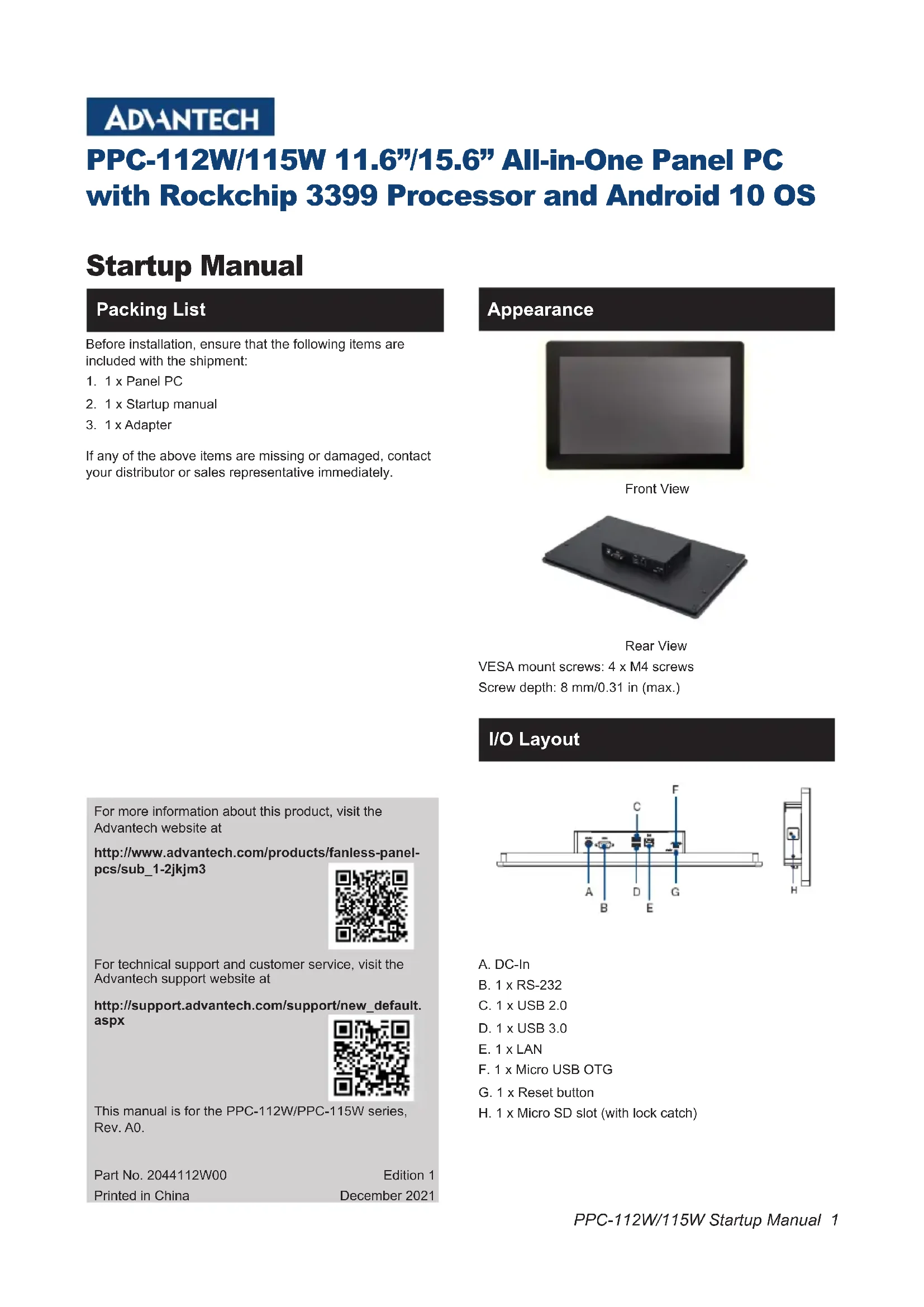 Retrouvez gratuitement la notice de l'appareil PPC115W Advantech au format PDF.