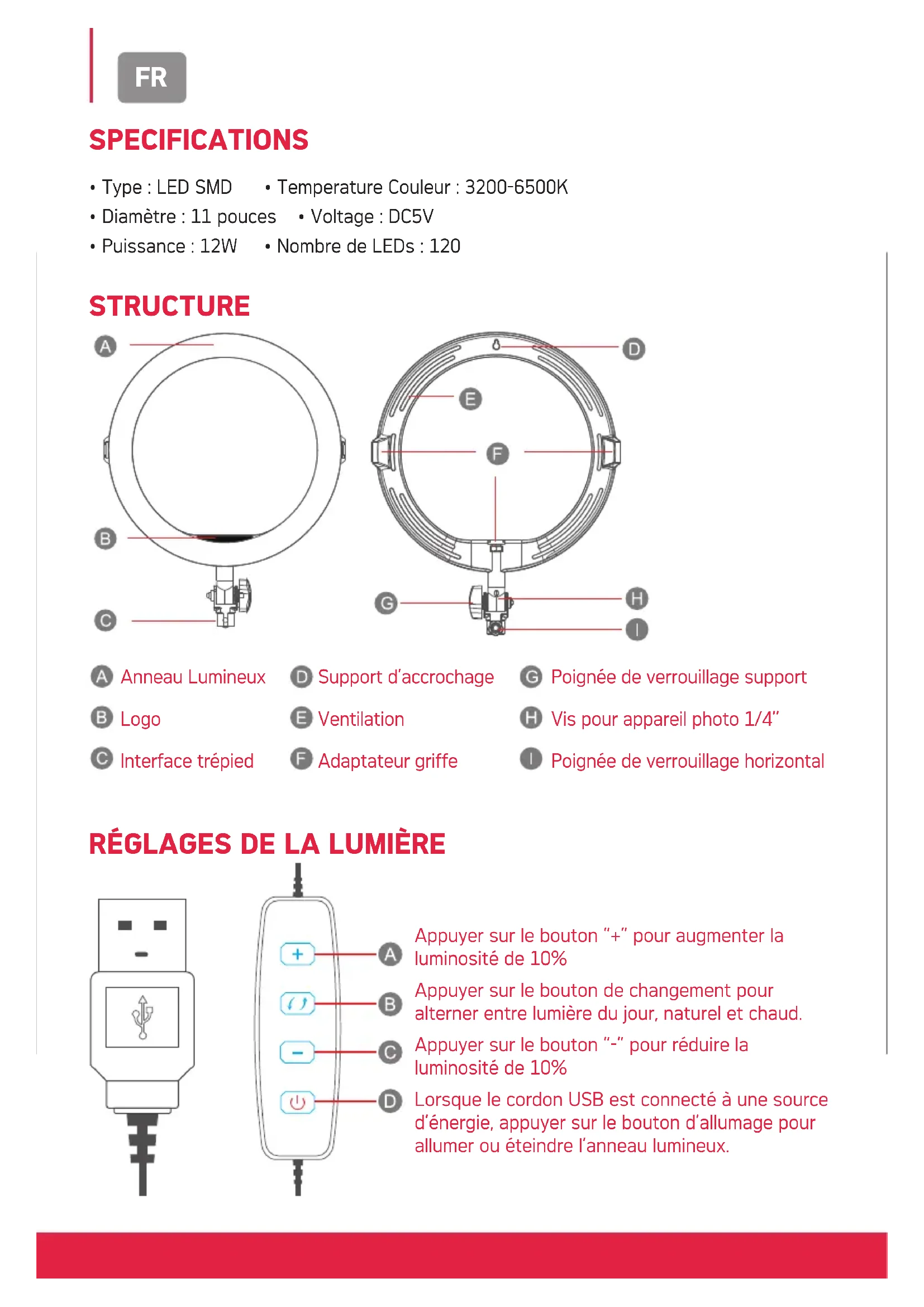 Anneau Lumineux Logo Interface trépied Appuyer sur le bouton “+” pour augmenter la luminosité de 10% Appuyer sur le bouton de changement pour alterner entre lumière du jour, naturel et chaud. Appuyer sur le bouton “-” pour réduire la luminosité de 10% Lorsque le cordon USB est connecté à une source d’énergie, appuyer sur le bouton d’allumage pour allumer ou éteindre l’anneau lumineux. Poignée de verrouillage support Vis pour appareil photo 1/4’’ Poignée de verrouillage horizontal Support d’accrochage Ventilation Adaptateur griffeFR INSTALLATION Pour déployer les pieds du trépied, desserrez la poignée de verrouillage située en bas du trépied, ouvrez les pieds et serrez la poignée de verrouillage pour sécuriser la position. Monter l’anneau lumineux 11 pouces au trépied Faire pivoter la base de l’anneau lumineux sur la vis du trépied jusqu’à qu’il soit bien fixé. Ajuster la hauteur du trépied La taille du trépied est réglable à quatre points différents, chaque point dispose d’un clip de verrouillage qui s’ouvre et qui se referme. Pour ajuster la longueur d’une des parties extensibles du trépied, ouvrez le clip correspondant, ajustez la longueur et refermez le clip de verrouillage. Ajuster l’angle de l’anneau lumineux L’anneau lumineux peut pivoter verticalement et horizontalement. Pour le pivoter horizontalement, tournez la roue située en haut du trépied. Pour le pivoter verticalement, desserrez la poignée de verrouillage, positionnez dans l’angle voulu et resserrez la poignée. Poignée de verrouillage support Vis pour appareil photo 1/4’’ Poignée de verrouillage horizontalFR SUPPORTS POUR TÉLÉPHONE MOBILE ET APPAREIL PHOTO COMPACT Le support pour téléphone mobile est fixé sur l’anneau lumineux par défaut. Vous pouvez l’interchanger avec le support d’appareil photo compact inclus.
