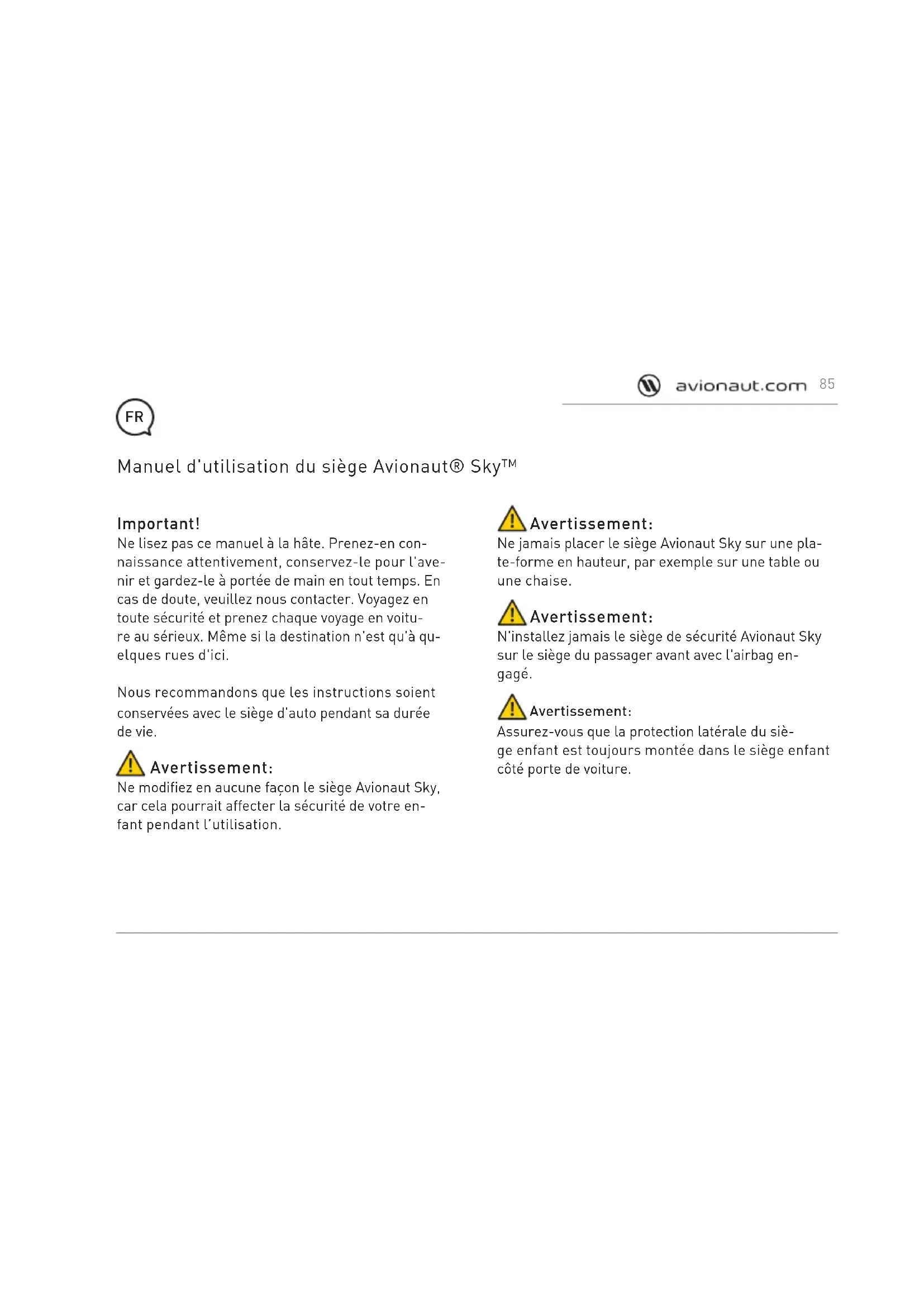 N'installez jamais le siège de sécurité Avionaut Sky sur le siège du passager avant avec l'airbag en- gagé.