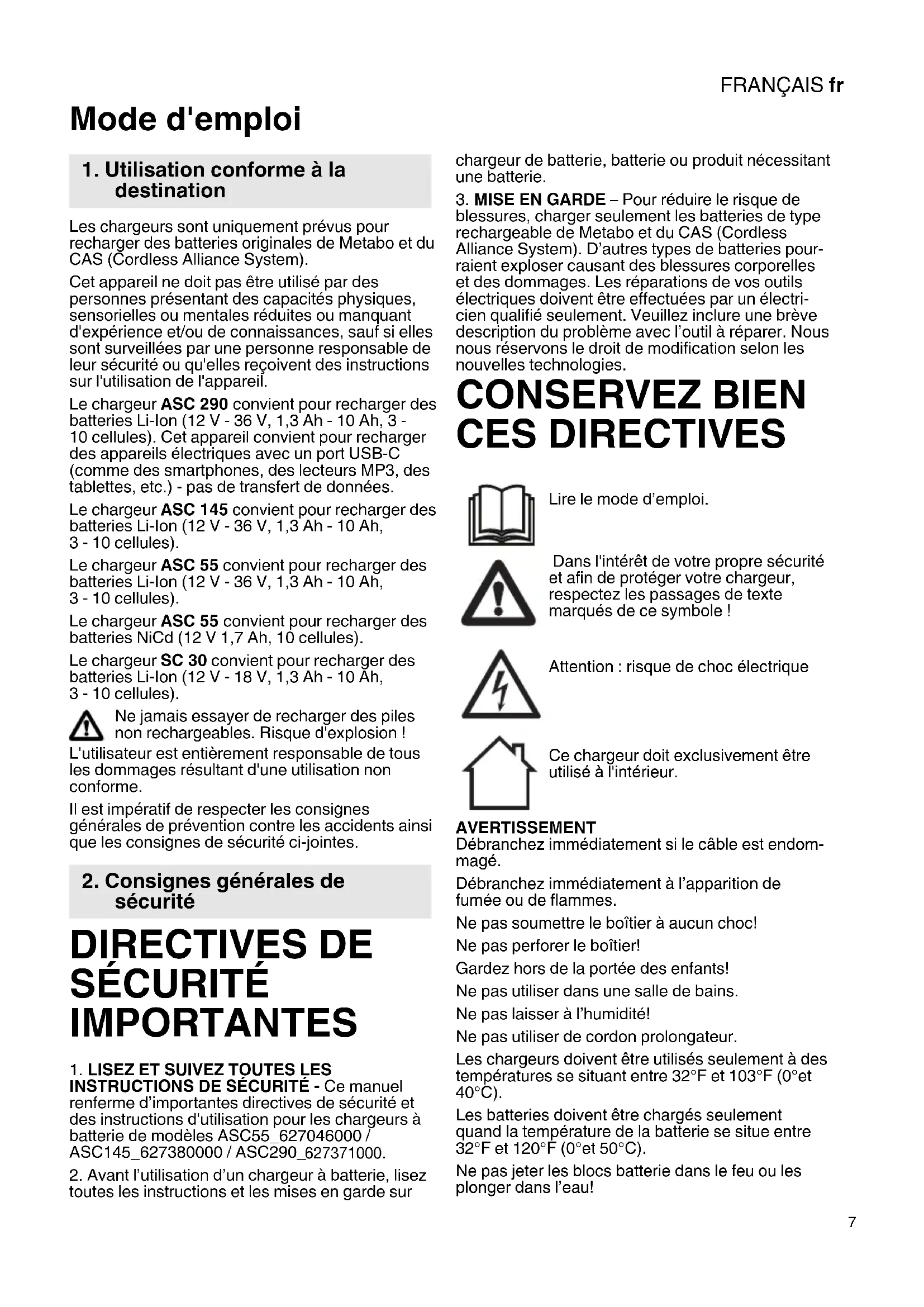 Mode d'emploi Les chargeurs sont uniquement prévus pour recharger des batteries originales de Metabo et du CAS (Cordless Alliance System). Cet appareil ne doit pas être utilisé par des personnes présentant des capacités physiques, sensorielles ou mentales réduites ou manquant d'expérience et/ou de connaissances, sauf si elles sont surveillées par une personne responsable de leur sécurité ou qu'elles reçoivent des instructions sur l'utilisation de l'appareil. Le chargeur ASC 290 convient pour recharger des batteries Li-Ion (12 V - 36 V, 1,3 Ah - 10 Ah, 3 - 10 cellules). Cet appareil convient pour recharger des appareils électriques avec un port USB-C (comme des smartphones, des lecteurs MP3, des tablettes, etc.) - pas de transfert de données. Le chargeur ASC 145 convient pour recharger des batteries Li-Ion (12 V - 36 V, 1,3 Ah - 10 Ah,