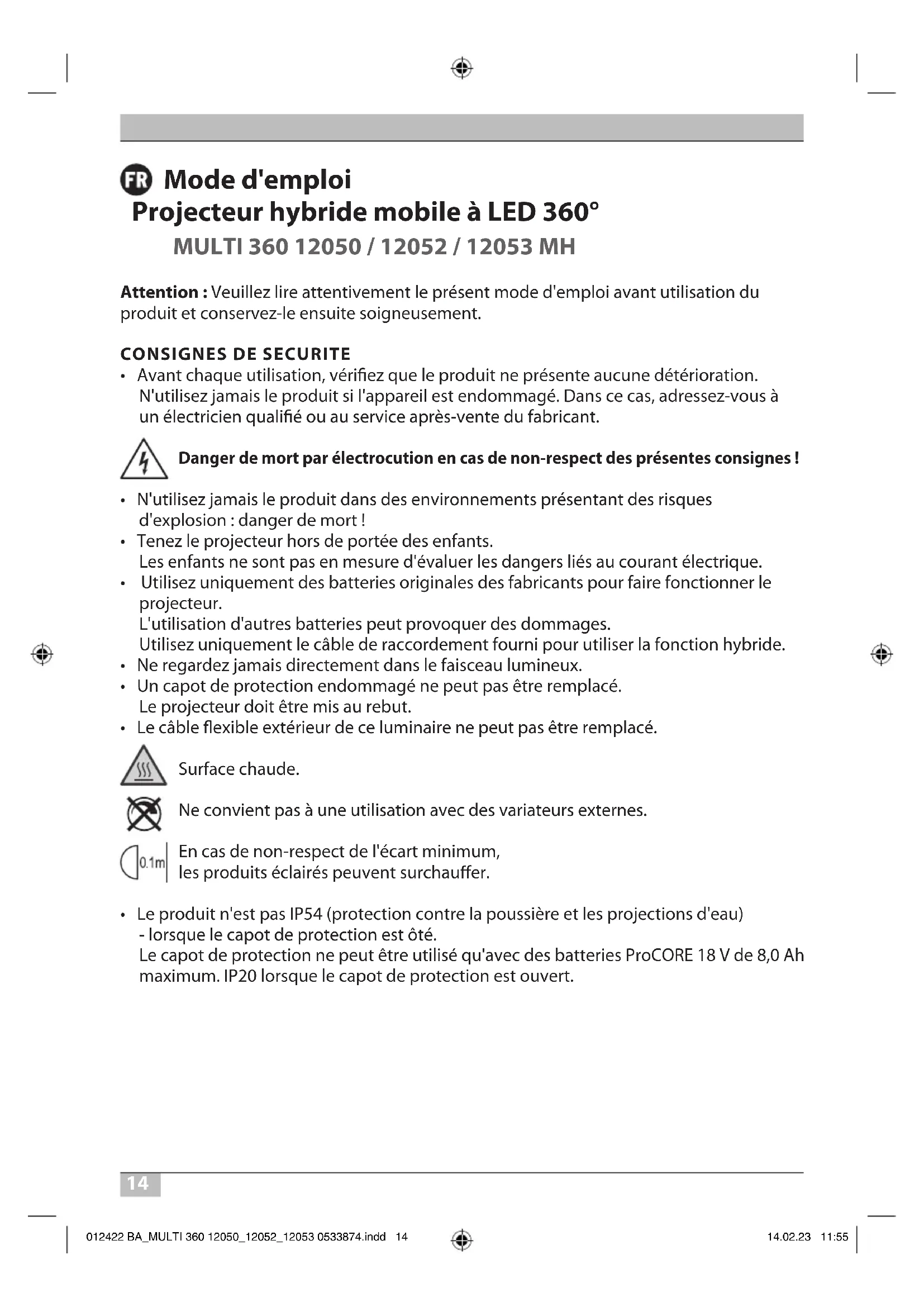 - Le produit n'est pas IP54 (protection contre la poussière et les projections d'eau) - lorsque le capot de protection est ôté. Le capot de protection ne peut être utilisé qu'avec des batteries ProCORE 18 V de 8,0 Ah maximum. IP20 lorsque le capot de protection est ouvert. 012422 BA_MULTI 360 12050_12052_12053 0533874.indd 14012422 BA_MULTI 360 12050_12052_12053 0533874.indd 14 14.02.23 11:5514.02.23 11:5515 MULTI 360 12050 / 12052 / 12053 MH Mode d'emploi CARACTERISTIQUES TECHNIQUES Classe de protection : II Indice de protection/Résistance aux chocs : IP54, IK08 Plages de température : -10 °C à +40 °C Câble de raccordement : H07RN-F 2x1,0 Fiche secteur MULTI 360 12050 MH : Type E + F Fiche secteur MULTI 360 12052 MH : Type J Fiche secteur MULTI 360 12053 MH : Type G Types : MULTI 360 12050 / 12052 / 12053 MH Types de batterie compatibles : Vous trouverez un aperçu de tous les adaptateurs disponibles et des batteries correspondantes sur notre site Internet www.brennenstuhl.com Tension nominale : 220-240 V~ 50/60 Hz Puissance : 100 W Courant max. : 0,7 A Facteur de puissance : 0,98 Surface de projection maximale : 825,32 cm