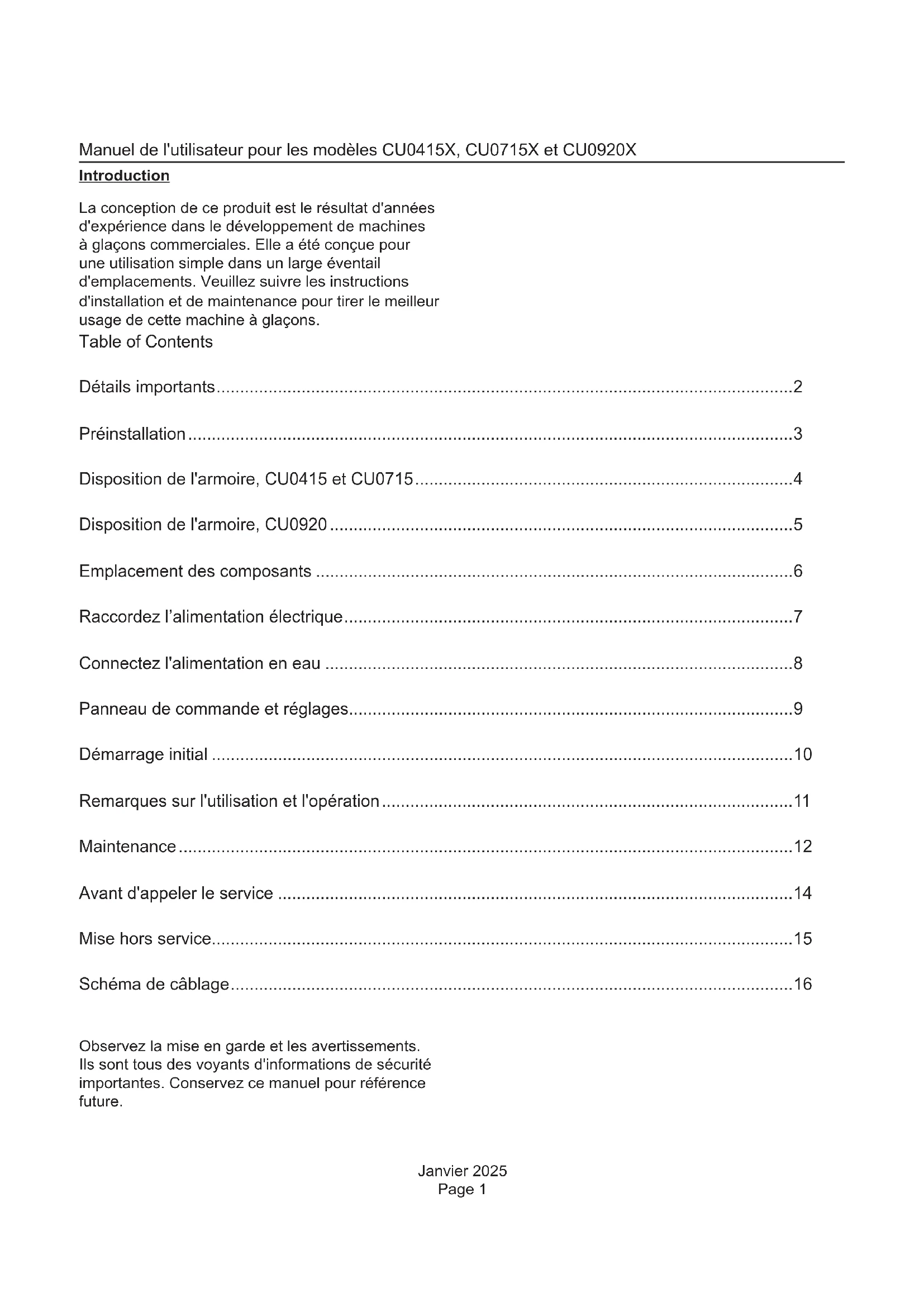- Schéma de câblage Observez la mise en garde et les avertissements. Ils sont tous des voyants d'informations de sécurité importantes. Conservez ce manuel pour référence future.Manuel de l'utilisateur pour les modèles CU0415X, CU0715X et CU0920X Janvier 2025 Page 2 Détails importants La machine est conçue pour un usage intérieur, dans un environnement contrôlé. Elle doit être gardée au sec, pas trop chaud ou soumise à un froid excessif. L'approvisionnement en eau et en électricité doit être maintenu ou la machine cessera de fabriquer des glaçons. Il n'y a pas des limites de niveau de chaleur ou de froid en ce qui concerne la pièce de la machine. p. 16