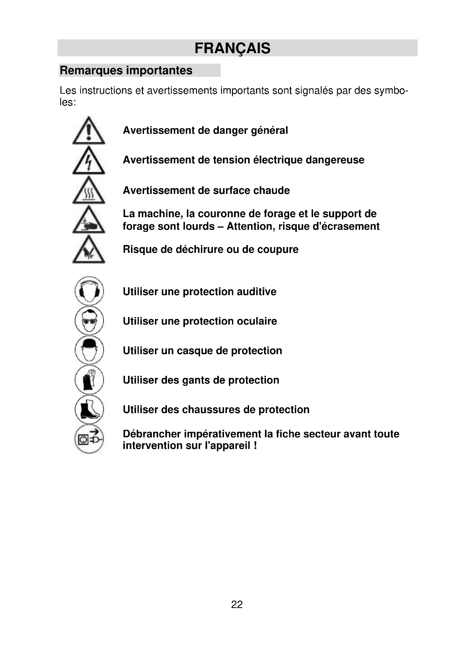 FRANÇAIS Remarques importantes Les instructions et avertissements importants sont signalés par des symbo- les: