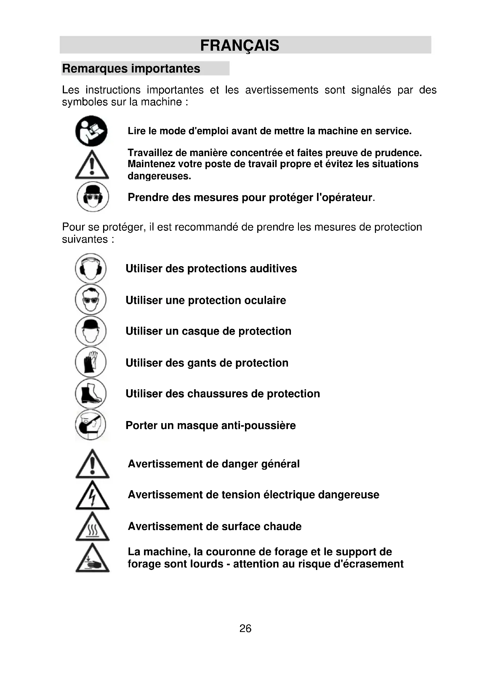 Lothar Lässig Frank Markert General Manager Head of Engineering Eibenstock, 25.06.2025 Subject to change without notice.26 FRANÇAIS Remarques importantes Les instructions importantes et les avertissements sont signalés par des symboles sur la machine :