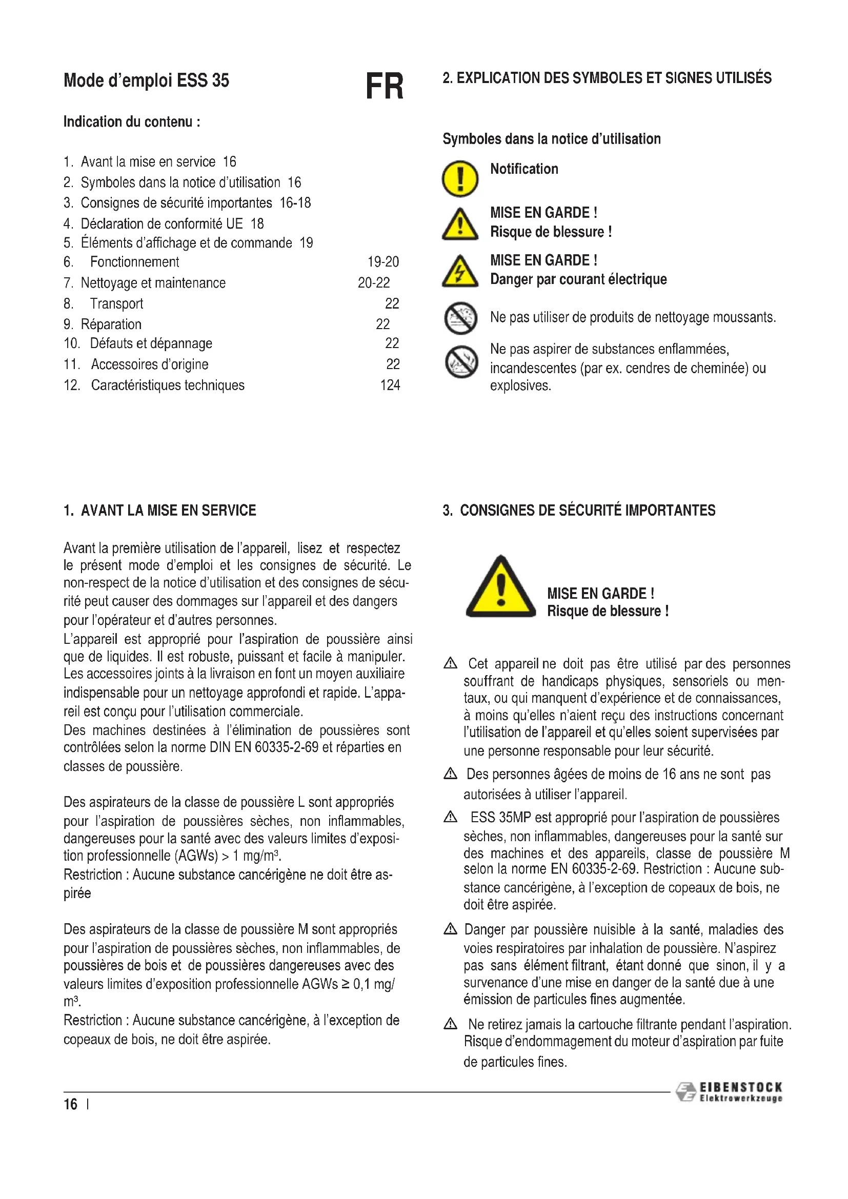 MISE EN GARDE ! Risque de blessure ! Symboles dans la notice d’utilisation MISE EN GARDE ! Risque de blessure ! MISE EN GARDE ! Danger par courant électrique Ne pas utiliser de produits de nettoyage moussants. Ne pas aspirer de substances enammées, incandescentes (par ex. cendres de cheminée) ou explosives. m Cet appareil ne doit pas être utilisé par des personnes souffrant de handicaps physiques, sensoriels ou men- taux, ou qui manquent d’expérience et de connaissances, à moins qu’elles n’aient reçu des instructions concernant l’utilisation de l’appareil et qu’elles soient supervisées par une personne responsable pour leur sécurité. m Des personnes âgées de moins de 16 ans ne sont pas autorisées à utiliser l’appareil. m ESS 35MP est approprié pour l’aspiration de poussières sèches, non inammables, dangereuses pour la santé sur des machines et des appareils, classe de poussière M selon la norme EN 60335-2-69. Restriction : Aucune sub- stance cancérigène, à l’exception de copeaux de bois, ne doit être aspirée. m Danger par poussière nuisible à la santé, maladies des voies respiratoires par inhalation de poussière. N’aspirez pas sans élément ltrant, étant donné que sinon, il y a survenance d’une mise en danger de la santé due à une émission de particules nes augmentée. m Ne retirez jamais la cartouche ltrante pendant l’aspiration. Risque d’endommagement du moteur d’aspiration par fuite de particules nes.