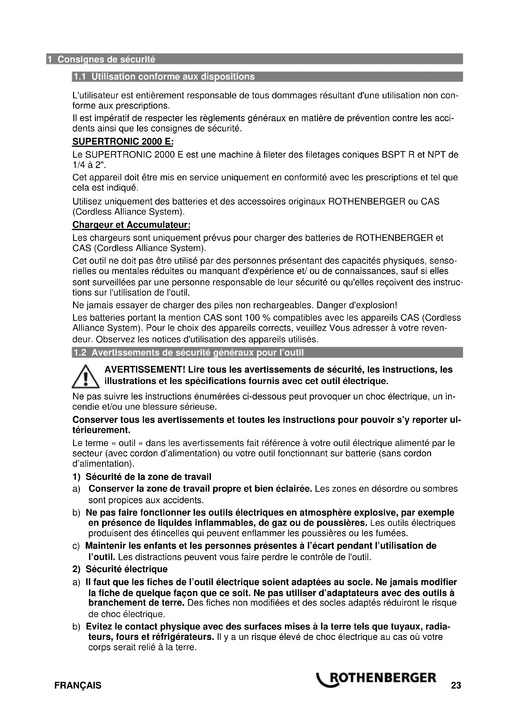 L'utilisateur est entièrement responsable de tous dommages résultant d'une utilisation non con- forme aux prescriptions. Il est impératif de respecter les règlements généraux en matière de prévention contre les acci- dents ainsi que les consignes de sécurité. SUPERTRONIC 2000 E: Le SUPERTRONIC 2000 E est une machine à fileter des filetages coniques BSPT R et NPT de 1/4 à 2". Cet appareil doit être mis en service uniquement en conformité avec les prescriptions et tel que cela est indiqué. Utilisez uniquement des batteries et des accessoires originaux ROTHENBERGER ou CAS (Cordless Alliance System). Chargeur et Accumulateur: Les chargeurs sont uniquement prévus pour charger des batteries de ROTHENBERGER et CAS (Cordless Alliance System). Cet outil ne doit pas être utilisé par des personnes présentant des capacités physiques, senso- rielles ou mentales réduites ou manquant d'expérience et/ ou de connaissances, sauf si elles sont surveillées par une personne responsable de leur sécurité ou qu'elles reçoivent des instruc- tions sur l'utilisation de l'outil. Ne jamais essayer de charger des piles non rechargeables. Danger d'explosion! Les batteries portant la mention CAS sont 100 % compatibles avec les appareils CAS (Cordless Alliance System). Pour le choix des appareils corrects, veuillez Vous adresser à votre reven- deur. Observez les notices d'utilisation des appareils utilisés.