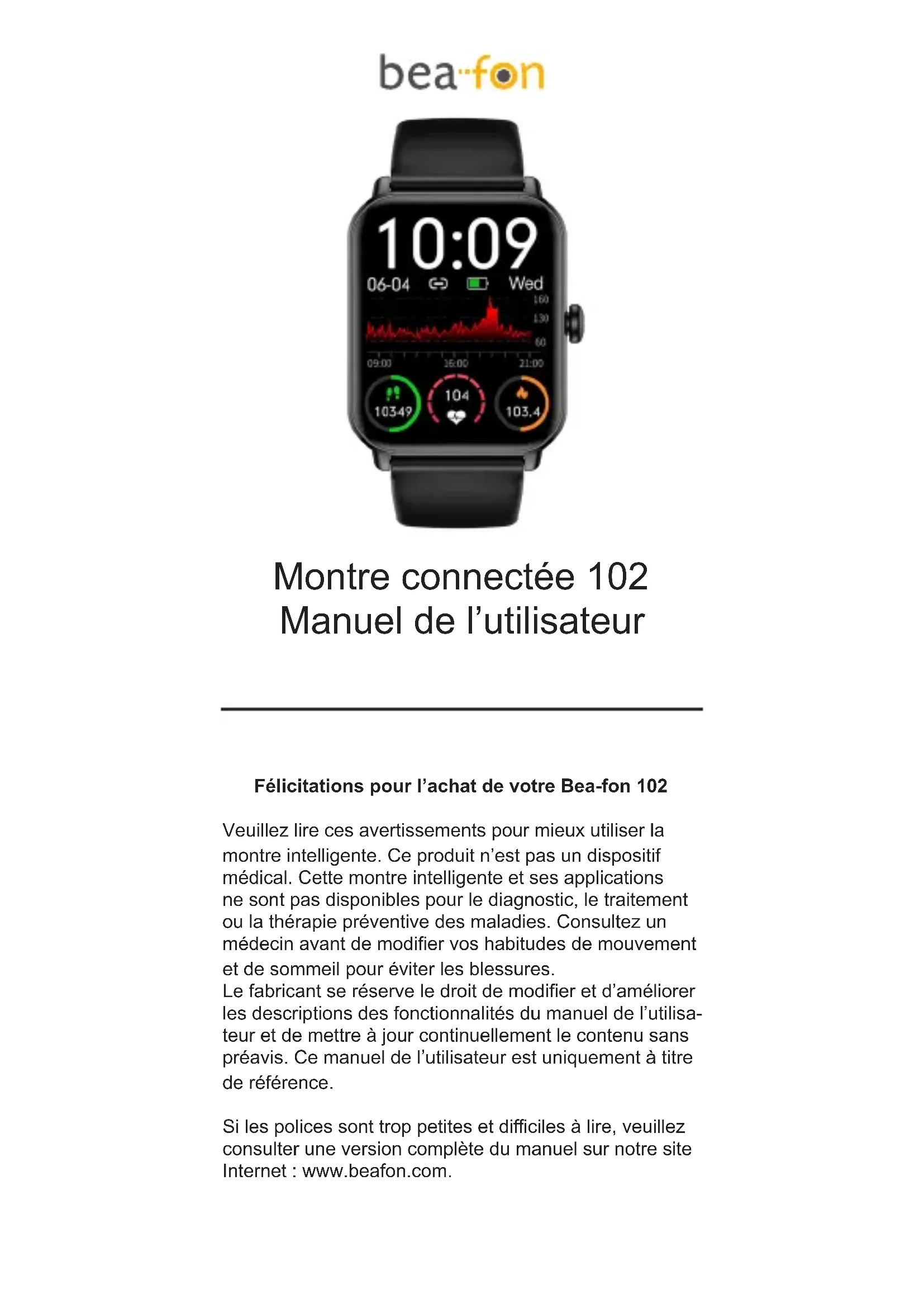 Montre connectée 102 Manuel de l’utilisateur Félicitations pour l’achat de votre Bea-fon 102 Veuillez lire ces avertissements pour mieux utiliser la montre intelligente. Ce produit n’est pas un dispositif médical. Cette montre intelligente et ses applications ne sont pas disponibles pour le diagnostic, le traitement ou la thérapie préventive des maladies. Consultez un médecin avant de modier vos habitudes de mouvement et de sommeil pour éviter les blessures. Le fabricant se réserve le droit de modier et d’améliorer les descriptions des fonctionnalités du manuel de l’utilisa- teur et de mettre à jour continuellement le contenu sans préavis. Ce manuel de l’utilisateur est uniquement à titre de référence. Si les polices sont trop petites et diciles à lire, veuillez consulter une version complète du manuel sur notre site Internet : www.beafon.com.I. Mode d’emploi Rappel important : pour utiliser ce produit, vous devez télécharger l’application et non seulement le connecter par Bluetooth, mais aussi dans l’application. Veuillez en prendre note.