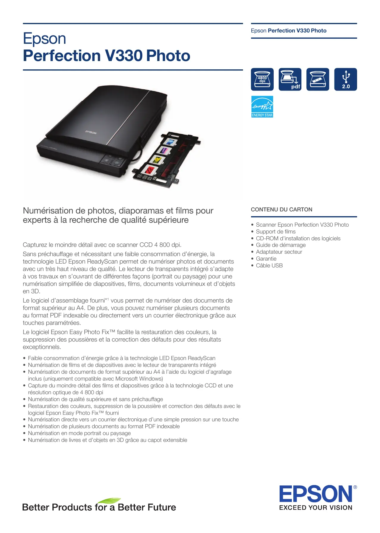 Epson Perfection V330 Photo Epson Perfection V330 Photo Numérisation de photos, diaporamas et films pour experts à la recherche de qualité supérieure