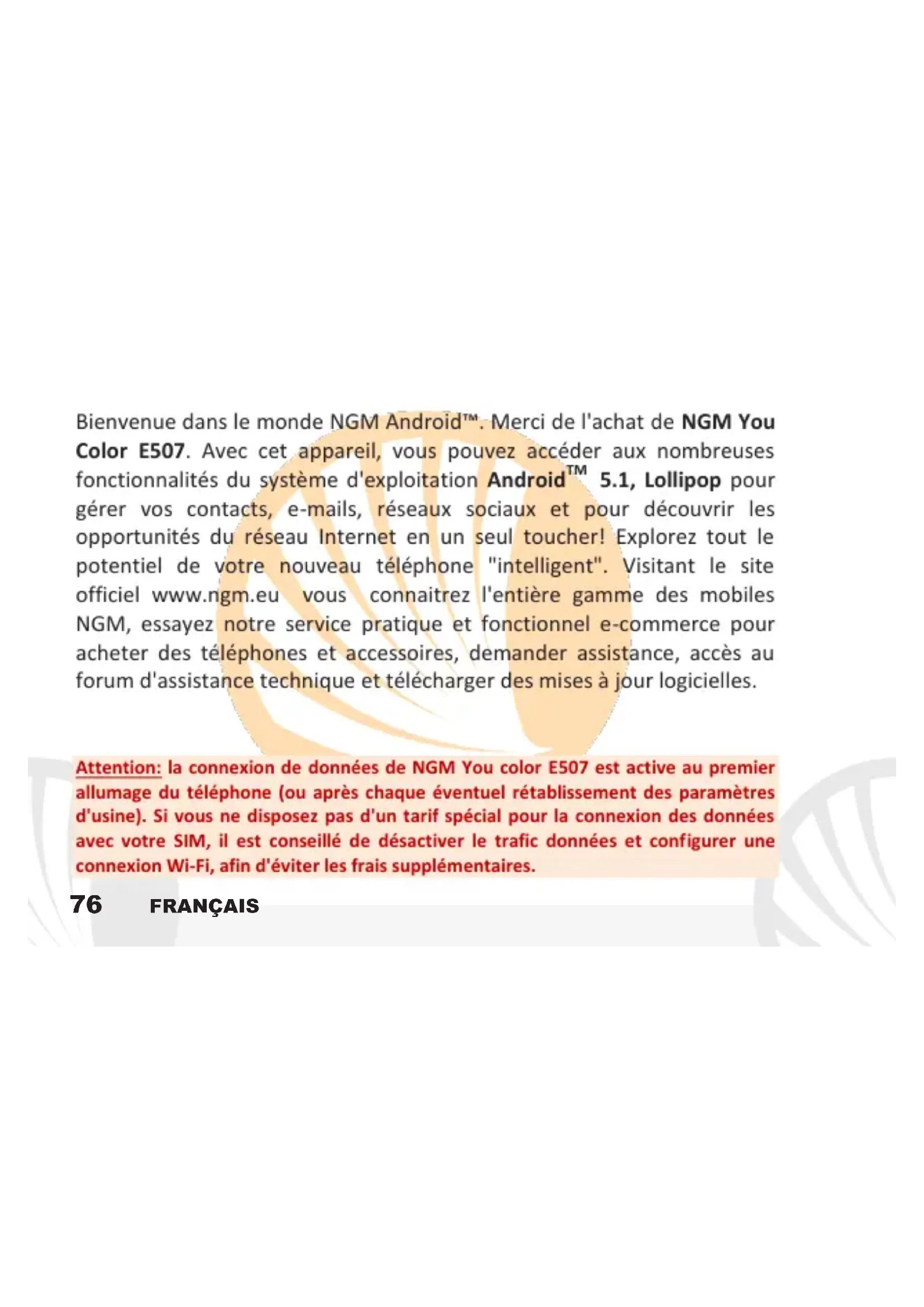 5.1, Lollipop pour gérer vos contacts, e-mails, réseaux sociaux et pour découvrir les opportunités du réseau Internet en un seul toucher! Explorez tout le potentiel de votre nouveau téléphone "intelligent". Visitant le site officiel www.ngm.eu vous connaitrez l'entière gamme des mobiles NGM, essayez notre service pratique et fonctionnel e-commerce pour acheter des téléphones et accessoires, demander assistance, accès au forum d'assistance technique et télécharger des mises à jour logicielles.