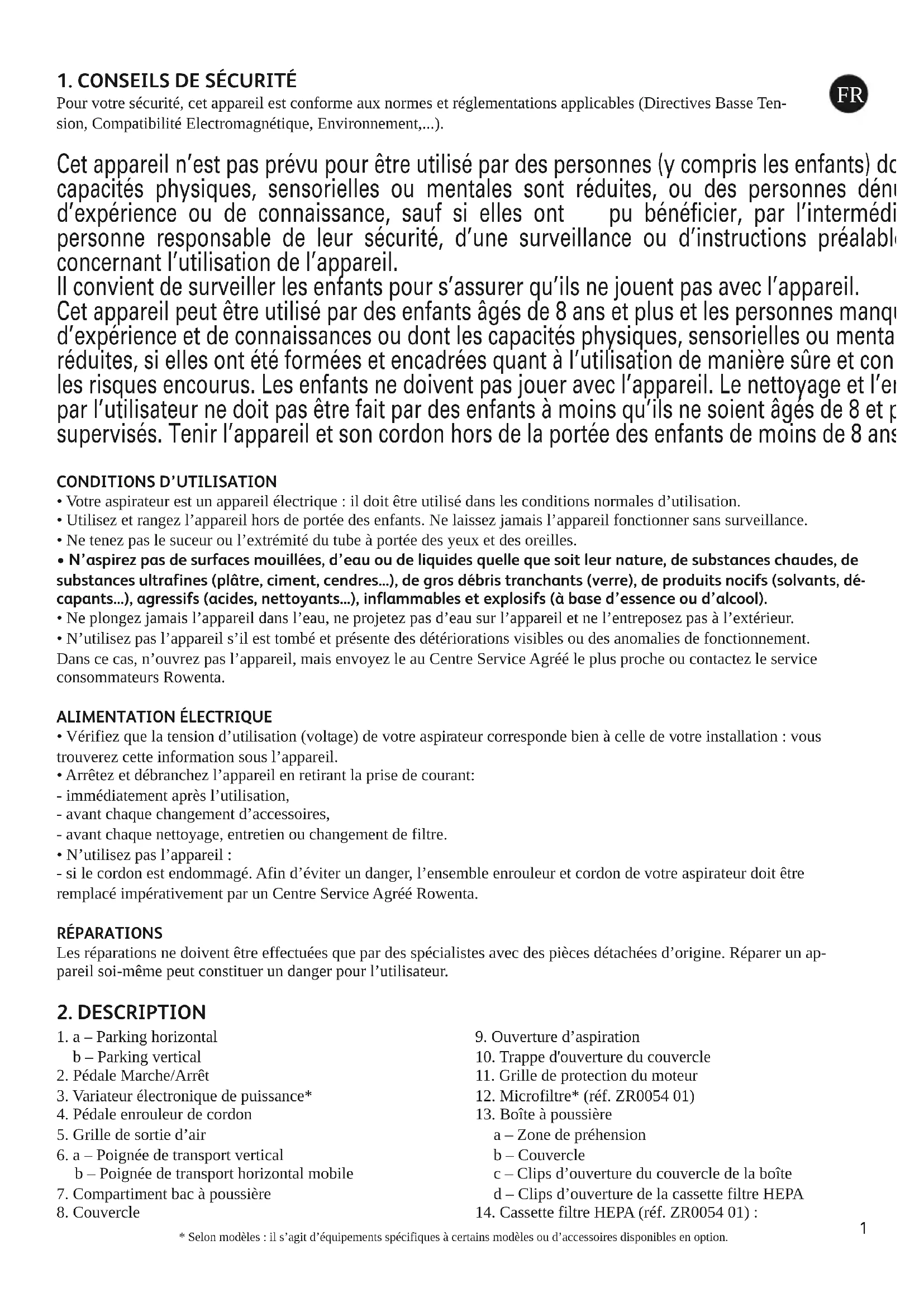 - N’utilisez pas l’appareil : - si le cordon est endommagé. Afin d’éviter un danger, l’ensemble enrouleur et cordon de votre aspirateur doit être remplacé impérativement par un Centre Service Agréé Rowenta. RÉPARATIONS Les réparations ne doivent être effectuées que par des spécialistes avec des pièces détachées d’origine. Réparer un ap- pareil soi-même peut constituer un danger pour l’utilisateur.