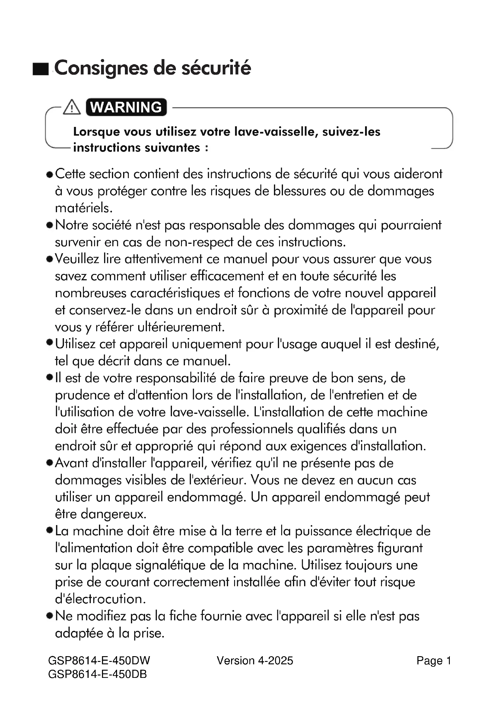 GARANTIE & SERVICES.....................................................................................Cette section contient des instructions de sécurité qui vous aideront à vous protéger contre les risques de blessures ou de dommages matériels. Notre société n'est pas responsable des dommages qui pourraient survenir en cas de non-respect de ces instructions. Veuillez lire attentivement ce manuel pour vous assurer que vous savez comment utiliser efficacement et en toute sécurité les nombreuses caractéristiques et fonctions de votre nouvel appareil et conservez-le dans un endroit sûr à proximité de l'appareil pour vous y référer ultérieurement. Utilisez cet appareil uniquement pour l'usage auquel il est destiné, tel que décrit dans ce manuel. Il est de votre responsabilité de faire preuve de bon sens, de prudence et d'attention lors de l'installation, de l'entretien et de l'utilisation de votre lave-vaisselle. L'installation de cette machine doit être effectuée par des professionnels qualifiés dans un endroit sûr et approprié qui répond aux exigences d'installation. Avant d'installer l'appareil, vérifiez qu'il ne présente pas de dommages visibles de l'extérieur. Vous ne devez en aucun cas utiliser un appareil endommagé. Un appareil endommagé peut être dangereux. La machine doit être mise à la terre et la puissance électrique de l'alimentation doit être compatible avec les paramètres figurant sur la plaque signalétique de la machine. Utilisez toujours une prise de courant correctement installée afin d'éviter tout risque d'électrocution. Ne modifiez pas la fiche fournie avec l'appareil si elle n'est pas adaptée à la prise. Lorsque vous utilisez votre lave-vaisselle, suivez-les instructions suivantes Consignes de sécurité WARNING GSP8614-E-450DW Version 4-2025 Page 1 GSP8614-E-450DBLa pression d'eau de fonctionnement de cette machine doit être comprise entre 0,04 à 1,0 MPa. Lors de l'installation, utilisez de nouveaux tuyaux pour vous connecter à la source d'eau ; les anciens tuyaux ne doivent pas être réutilisés. Ne vous appuyez pas ou ne montez pas sur la porte ouverte du lave-vaisselle pour éviter de l'endommager. Ne placez pas d'objets lourds sur la porte lorsqu'elle est ouverte. L'appareil pourrait basculer vers l'avant. Fermez la porte du lave-vaisselle après utilisation pour éviter les accidents. N'utilisez que des détergents, du sel et des produits de rinçage spécifiquement conçus pour le lave-vaisselle. Ne mettez pas de solvants dans le compartiment à détergent du lave- vaisselle pour éviter tout risque d'explosion. Ne mettez au lave-vaisselle que des articles compatibles avec ce type de produit. En cas de doute, vérifiez auprès du fabricant des articles. Lors du chargement du lave-vaisselle, veillez à respecter les recommandations relatives aux meilleures pratiques de chargement, et veillez également à ce que les objets pointus tels que les couteaux soient chargés dans le panier avec leur pointe vers le bas ou placés en position horizontale afin d'éviter les accidents. N'ouvrez pas la porte du lave-vaisselle lorsqu'un programme est en cours. S'il est nécessaire de le faire, n'ouvrez que légèrement la porte pour permettre au lave-vaisselle d'interrompre le programme et éviter que de l'eau ne s'écoule. N'oubliez pas que l'eau du lave- vaisselle peut être très chaude lorsque le programme est en cours. Lorsque le lave-vaisselle n'est pas utilisé, nous vous recommandons de fermer l'arrivée d'eau au robinet d'alimentation et de débrancher l'alimentation principale. Si vous laissez le lave-vaisselle pendant une période prolongée, laissez la porte légèrement ouverte pour éviter la formation d'odeurs désagréables. GSP8614-E-450DW Version 4-2025 Page 2 GSP8614-E-450DBCet appareil peut être utilisé par des enfants âgés de 8 ans et plus et par des personnes dont les capacités physiques, sensorielles ou mentales sont réduites ou qui manquent d'expérience et de connaissances, à condition qu'ils aient reçu une surveillance ou des instructions concernant l'utilisation de l'appareil en toute sécurité et qu'ils comprennent les risques encourus. Les enfants ne doivent pas jouer avec l'appareil. Le nettoyage et l'entretien ne doivent pas être effectués par des enfants sans surveillance. (Pour IEC60335-1) Cet appareil n'est pas destiné à être utilisé par des personnes (y compris des enfants) dont les capacités physiques, sensorielles ou mentales sont réduites, ou qui manquent d'expérience et de connaissances, à moins qu'elles n'aient pu bénéficier d'une surveillance ou d'instructions concernant l'utilisation de l'appareil de la part d'une personne responsable de leur sécurité. (Pour IEC60335-1) Le matériel d'emballage peut être dangereux pour les enfants ! Les enfants doivent être surveillés pour s'assurer qu'ils ne jouent pas avec l'appareil. Les enfants pourraient s'enfermer dans l'appareil. C'est pourquoi, lorsque vous vous débarrassez d'un vieil appareil, débranchez la prise et mettez-la de côté. Endommager la serrure de la porte de manière à ce qu'elle ne puisse plus être fermée. Pour éviter tout risque d'électrocution, ne pas immerger l'appareil, le cordon ou la fiche dans l'eau ou dans un autre liquide. Veuillez débrancher l'appareil avant de le nettoyer et de l'entretenir. Utilisez un chiffon doux humidifié avec du savon doux, puis utilisez un chiffon sec pour l'essuyer à nouveau. Si le cordon d'alimentation est endommagé, il doit être remplacé par le fabricant, son agent de service ou une personne de qualification similaire afin d'éviter tout danger. Les ouvertures sur le fond ne doivent pas être obstruées par un tapis. GSP8614-E-450DW Version 4-2025 Page 3 GSP8614-E-450DBPour économiser de l'énergie, en mode veille, l'appareil s'éteint automatiquement au bout de 3 minutes sans intervention de l'utilisateur. Pour réduire la consommation d'énergie et d'eau,