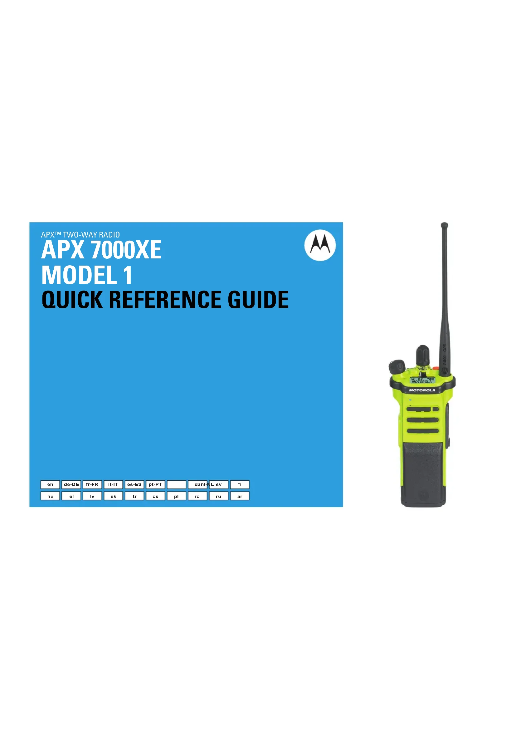 APX™ série 7000XE Radios portatives numériques Carte de référence rapide Sécurité des produits et exposition aux fréquences radio pour les radios professionnelles portatives ATTENTION ! Cette radio est réservée à un usage professionnel uniquement. Avant d’utiliser la ra dio, lisez le guide Sécurité des produits et exposition aux fréquences radio pour les radios professionnelles portatives. Il contient d’importantes instructions de fonctionnement relatives à la sécurité et à l’exposition aux fréquences radio, ainsi que des informations sur le contrôle de conformité aux normes et réglementations applicables. Commandes de la radio Mise sous/hors tension de la radio Zones et canaux Réception et transmission Envoi d’une alarme d’urgence