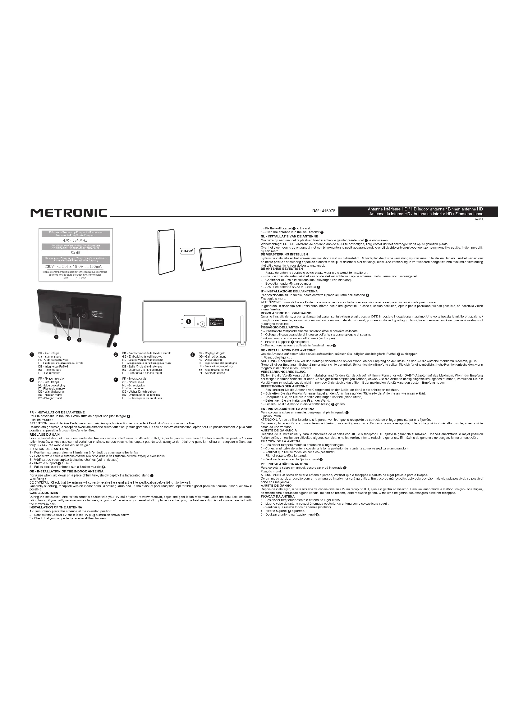 50 dB 230V 50Hz / 9,0V 100mA Fréquence/Frequency/Frequentie/FrequenzaFrequencia/Freqüência/Frequenz 5V 100mA Câble d’antenne/aerial cable/antennekabel/cavo d’antennacable de antena/cabo de antena/Antennenkabel Amplification/Versterking/AmplificazioneAmplificación/Amplificação/VerstärkungAlimentation/Power supply/Voorziening/AlimentazioneAlimentación/Alimentação/VersorgungFR - INSTALLATION DE L’ANTENNE Pour la poser sur un meuble il vous suft de déplier son pied intégré 1. Fixation murale :ATTENTION : Avant de xer l’antenne au mur, vériez que la réception est correcte à l’endroit où vous comptez la xer. De manière générale, la réception avec une antenne d’intérieur n’est jamais garantie. En cas de mauvaise réception, optez pour un positionnement le plus haut possible, si possible à proximité d’une fenêtre.RÉGLAGE DU GAIN Lors de l’installation, et pour la recherche de chaînes avec votre téléviseur ou décodeur TNT, réglez le gain au maximum. Une fois la meilleure position / orien- tation trouvée, si vous captez mal certaines chaînes, ou que vous ne les captez pas du tout, essayez de réduire le gain, la meilleure réception n’étant pas toujours assurée avec le maximum de gain.FIXATION DE L’ANTENNE1 - Positionnez temporairement l’antenne à l’endroit où vous souhaitez la xer.2 - Connectez le câble d’antenne coaxial à la prise arrière de l’antenne comme expliqué ci-dessous.3 - Vériez que vous captez toutes les chaînes (voir ci-dessus).4 - Fixez le support 2 au mur.5 - Faites coulisser l’antenne sur la xation murale 2.GB - INSTALLATION OF THE INDOOR ANTENNA For a use when laid down on a piece of furniture, simply deploy the intregrated stand 1. Wall xing : BE CAREFUL : Check that the antenna will correctly receive the signal at the intended location before xing it to the wall. Generally speaking, reception with an indoor aerial is never guaranteed. In the event of poor reception, opt for the highest possible position, near a window if possible.GAIN ADJUSTMENT During the installation, and for the channel search with your TV set or your Freeview receiver, adjust the gain to the maximum. Once the best position/orien- tation found, if you badly receive some channels, or you don’t receive any channel at all, try to reduce the gain, the best reception is not always reached with the maximum gain.INSTALLATION OF THE ANTENNA1 - Temporarily place the antenna at the intended position.2 - Connect the Coaxial TV cable to the TV plug at back as shown below. 3 - Check that you can perfectly receive all the channels.