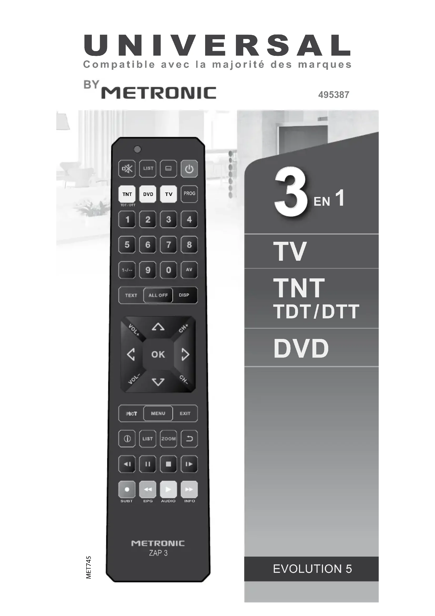 Nous vous remercions d’avoir choisi une télécommande universelle METRONIC et sommes persuadés qu’elle vous donnera entière satisfaction. Les modèles ZAP 2/3/4/6 permettent de piloter 2 à 6 appareils : TV, récepteur satellite (SAT), chaîne Hi-Fi (AUX), lecteur DVD (DVD), décodeur TNT (TNT) et BOX ADSL (BOX) selon les cas. Après avoir mis les piles 1.5V AAA (non fournies) dans l’emplacement prévu à cet eet, vous pourrez installer votre télécommande pour chaque type d’appareil à commander. La télécommande universelle METRONIC est conçue pour commander la plupart des appareils de chaque marque. Pour cela, vous avez le choix entre deux méthodes d’installation : par code Marque ou par recherche automatique. Dans les procédures ci-dessous, nous donnons un exemple pour le téléviseur (TV). Pour installer, par exemple, votre décodeur TNT ou votre lecteur DVD, remplacez «TV» par «TNT» ou «DVD». Après l’installation, il sut d’appuyer sur la touche TV, DVD ou TNT pour sélectionner un appareil puis le piloter en appuyant sur la touche désirée. A - Installation par code Marque