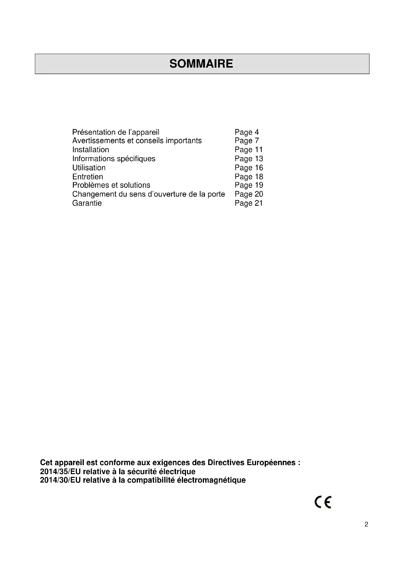 Présentation de l’appareil Page 4 Avertissements et conseils importants Page 7 Installation Informations spécifiques Page 11 Page 13 Utilisation Page 16 Entretien Page 18 Problèmes et solutions Page 19 Changement du sens d’ouverture de la porte Page 20 Garantie Page 21