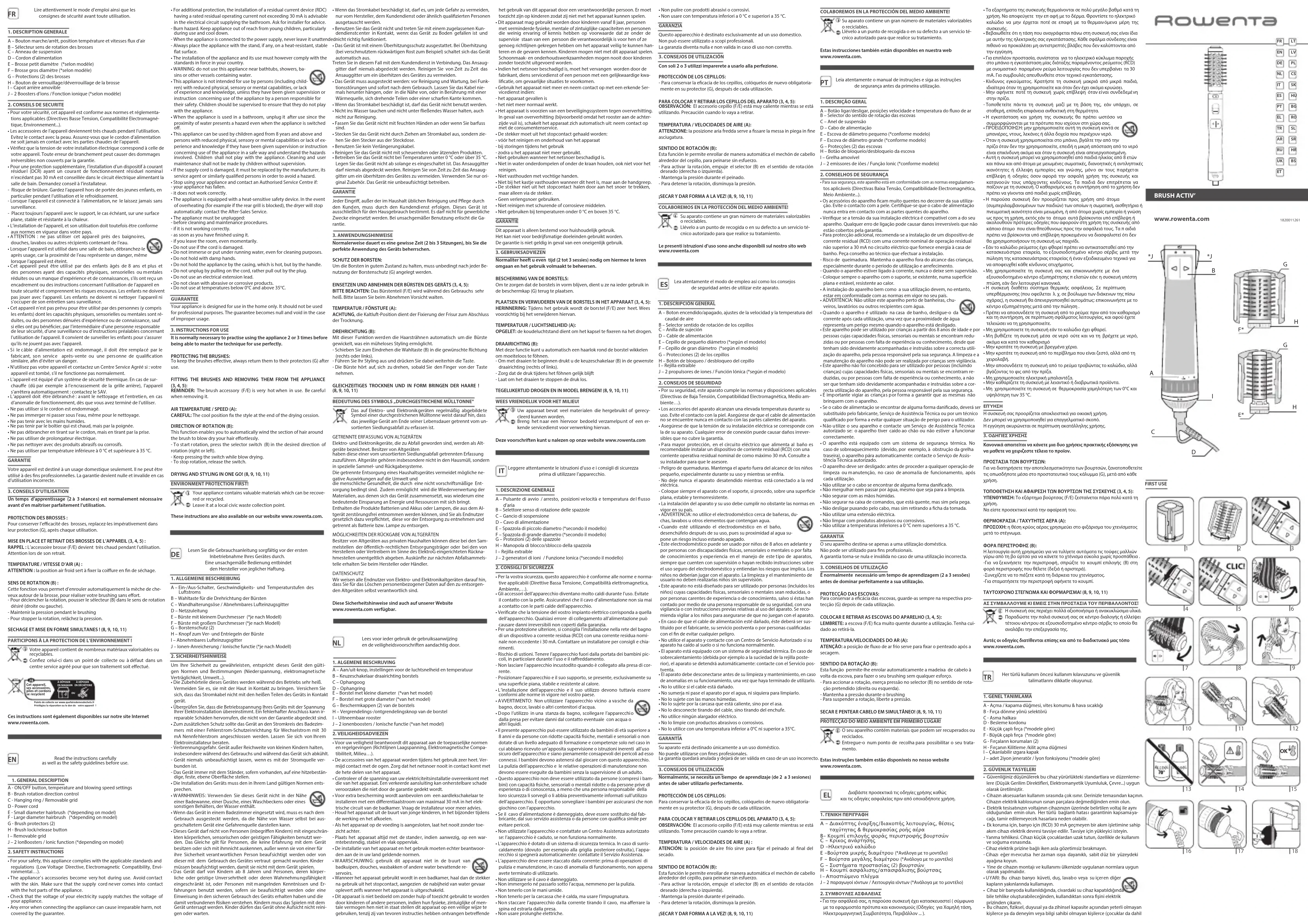 Un temps d’apprentissage (2 à 3 séances) est normalement nécessaire avant d’en maîtriser parfaitement l’utilisation. PROTECTION DES BROSSES : Pour conserver l’ecacité des brosses, replacez-les impérativement dans leur protection (G), après chaque utilisation. MISE EN PLACE ET RETRAIT DES BROSSES DE L’APPAREIL (3, 4, 5) : RAPPEL : L’accessoire brosse (F/E) devient très chaud pendant l’utilisation. Attention lors de son retrait. TEMPERATURE / VITESSE D’AIR (A) : ATTENTION : la position air froid sert à xer la coiure en n de séchage. SENS DE ROTATION (B) : Cette fonction vous permet d’enrouler automatiquement la mèche de che- veux autour de la brosse, pour réaliser votre brushing sans eort. - Pour déclencher la rotation, pousser le sélecteur (B) dans le sens de rotation désiré (droite ou gauche). - Maintenir la pression pendant le brushing - Pour stopper la rotation, relâchez la pression. SECHAGE ET MISE EN FORME SIMULTANES ! (8, 9, 10, 11) PARTICIPONS À LA PROTECTION DE L’ENVIRONNEMENT ! Votre appareil contient de nombreux matériaux valorisables ou recyclables. Conez celui-ci dans un point de collecte ou à défaut dans un centre service agréé pour que son traitement soit eectué. Points de collecte sur www.quefairedemesdechets.frWƌŝǀŝůĠŐŝĞnjůĂƌĠƉĂƌĂƟŽŶŽƵůĞĚŽŶĚĞ ǀŽƚƌĞĂƉƉĂƌĞŝů !À DÉPOSEREN MAGASINÀ DÉPOSEREN DÉCHÈTERIE