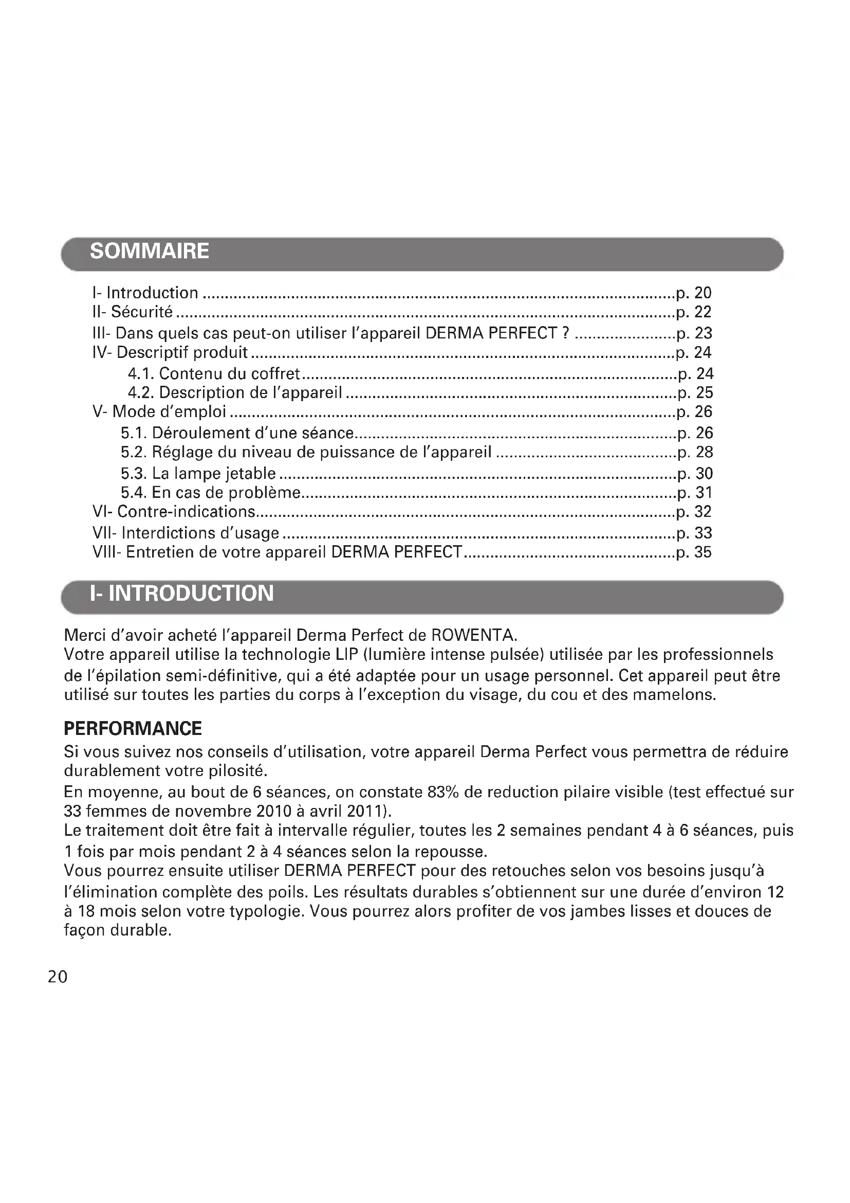 RO_EP9830_DERMA-PERFECT_1800122477_1800122477 03/02/12 15:51 Page19I- Introduction ...........................................................................................................p. 20 II- Sécurité .................................................................................................................p. 22 III- Dans quels cas peut-on utiliser l’appareil DERMA PERFECT ? .......................p. 23 IV- Descriptif produit ................................................................................................p. 24 4.1. Contenu du coffret.....................................................................................p. 24 4.2. Description de l’appareil ...........................................................................p. 25 V- Mode d’emploi .....................................................................................................p. 26 5.1. Déroulement d’une séance.........................................................................p. 26 5.2. Réglage du niveau de puissance de l’appareil .........................................p. 28 5.3. La lampe jetable ..........................................................................................p. 30 5.4. En cas de problème.....................................................................................p. 31 VI- Contre-indications...............................................................................................p. 32 VII- Interdictions d’usage .........................................................................................p. 33 VIII- Entretien de votre appareil DERMA PERFECT................................................p. 35 Merci d’avoir acheté l’appareil Derma Perfect de ROWENTA. Votre appareil utilise la technologie LIP (lumière intense pulsée) utilisée par les professionnels de l’épilation semi-définitive, qui a été adaptée pour un usage personnel. Cet appareil peut être utilisé sur toutes les parties du corps à l’exception du visage, du cou et des mamelons. PERFORMANCE Si vous suivez nos conseils d’utilisation, votre appareil Derma Perfect vous permettra de réduire durablement votre pilosité. En moyenne, au bout de 6 séances, on constate 83% de reduction pilaire visible (test effectué sur 33 femmes de novembre 2010 à avril 2011). Le traitement doit être fait à intervalle régulier, toutes les 2 semaines pendant 4 à 6 séances, puis 1 fois par mois pendant 2 à 4 séances selon la repousse. Vous pourrez ensuite utiliser DERMA PERFECT pour des retouches selon vos besoins jusqu’à l’élimination complète des poils. Les résultats durables s’obtiennent sur une durée d’environ 12 à 18 mois selon votre typologie. Vous pourrez alors profiter de vos jambes lisses et douces de façon durable. SOMMAIRE I- INTRODUCTION