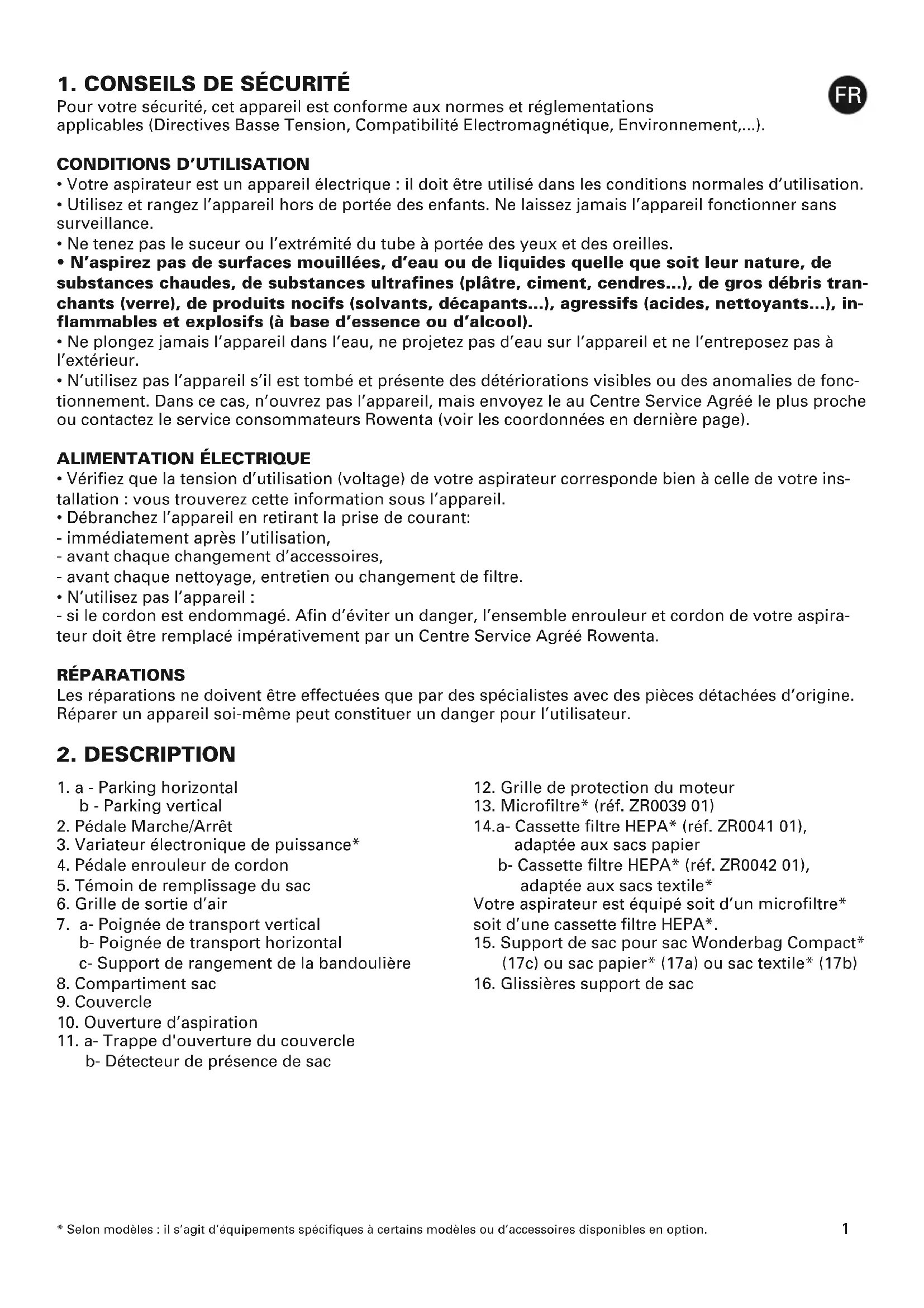 - N’utilisez pas l’appareil s’il est tombé et présente des détériorations visibles ou des anomalies de fonc- tionnement. Dans ce cas, n’ouvrez pas l’appareil, mais envoyez le au Centre Service Agréé le plus proche ou contactez le service consommateurs Rowenta (voir les coordonnées en dernière page). ALIMENTATION ÉLECTRIQUE