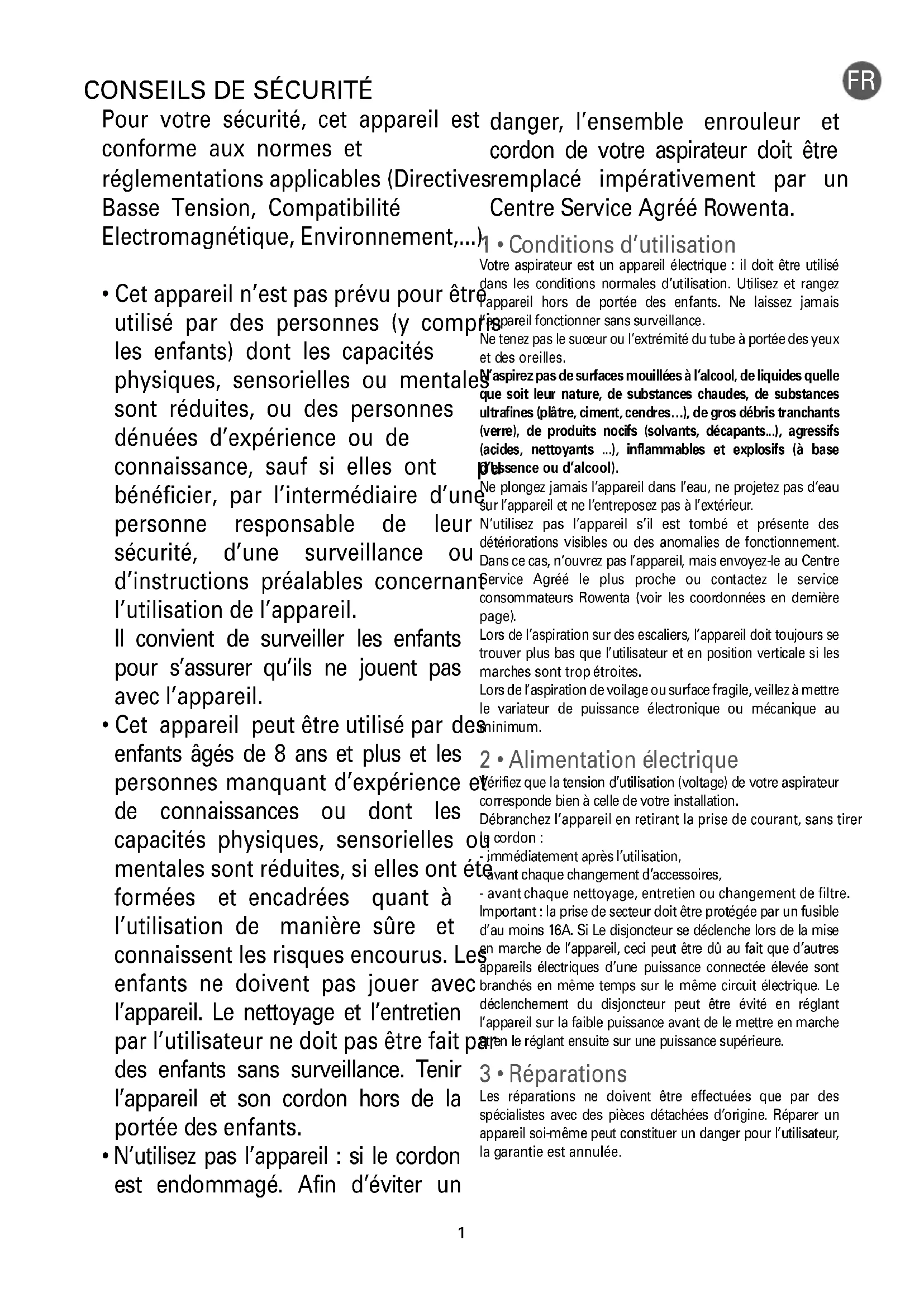 - N’utilisez pas l’appareil : si le cordon est endommagé. Afin d’éviter un danger, l’ensemble enrouleur et cordon de votre aspirateur doit être remplacé impérativement par un Centre Service Agréé Rowenta. 1 • Conditions d’utilisation Votre aspirateur est un appareil électrique : il doit être utilisé dans les conditions normales d’utilisation. Utilisez et rangez l’appareil hors de portée des enfants. Ne laissez jamais l’appareil fonctionner sans surveillance. Ne tenez pas le suceur ou l’extrémité du tube à portée des yeux et des oreilles. N’aspirez pas de surfaces mouillées à l’alcool, de liquides quelle que soit leur nature, de substances chaudes, de substances ultrafines (plâtre, ciment, cendres…), de gros débris tranchants (verre), de produits nocifs (solvants, décapants...), agressifs (acides, nettoyants ...), inflammables et explosifs (à base d’essence ou d’alcool). Ne plongez jamais l’appareil dans l’eau, ne projetez pas d’eau sur l’appareil et ne l’entreposez pas à l’extérieur. N’utilisez pas l’appareil s’il est tombé et présente des détériorations visibles ou des anomalies de fonctionnement. Dans ce cas, n’ouvrez pas l’appareil, mais envoyez-le au Centre Service Agréé le plus proche ou contactez le service consommateurs Rowenta (voir les coordonnées en dernière page). Lors de l’aspiration sur des escaliers, l’appareil doit toujours se trouver plus bas que l’utilisateur et en position verticale si les marches sont trop étroites. Lors de l’aspiration de voilage ou surface fragile, veillez à mettre le variateur de puissance électronique ou mécanique au minimum. 2 • Alimentation électrique Vérifiez que la tension d’utilisation (voltage) de votre aspirateur corresponde bien à celle de votre installation. Débranchez l’appareil en retirant la prise de courant, sans tirer le cordon : - immédiatement après l’utilisation, - avant chaque changement d’accessoires, - avant chaque nettoyage, entretien ou changement de filtre. Important : la prise de secteur doit être protégée par un fusible d’au moins 16A. Si Le disjoncteur se déclenche lors de la mise en marche de l’appareil, ceci peut être dû au fait que d’autres appareils électriques d’une puissance connectée élevée sont branchés en même temps sur le même circuit électrique. Le déclenchement du disjoncteur peut être évité en réglant l’appareil sur la faible puissance avant de le mettre en marche et en le réglant ensuite sur une puissance supérieure. 3 • Réparations Les réparations ne doivent être effectuées que par des spécialistes avec des pièces détachées d’origine. Réparer un appareil soi-même peut constituer un danger pour l’utilisateur, la garantie est annulée.