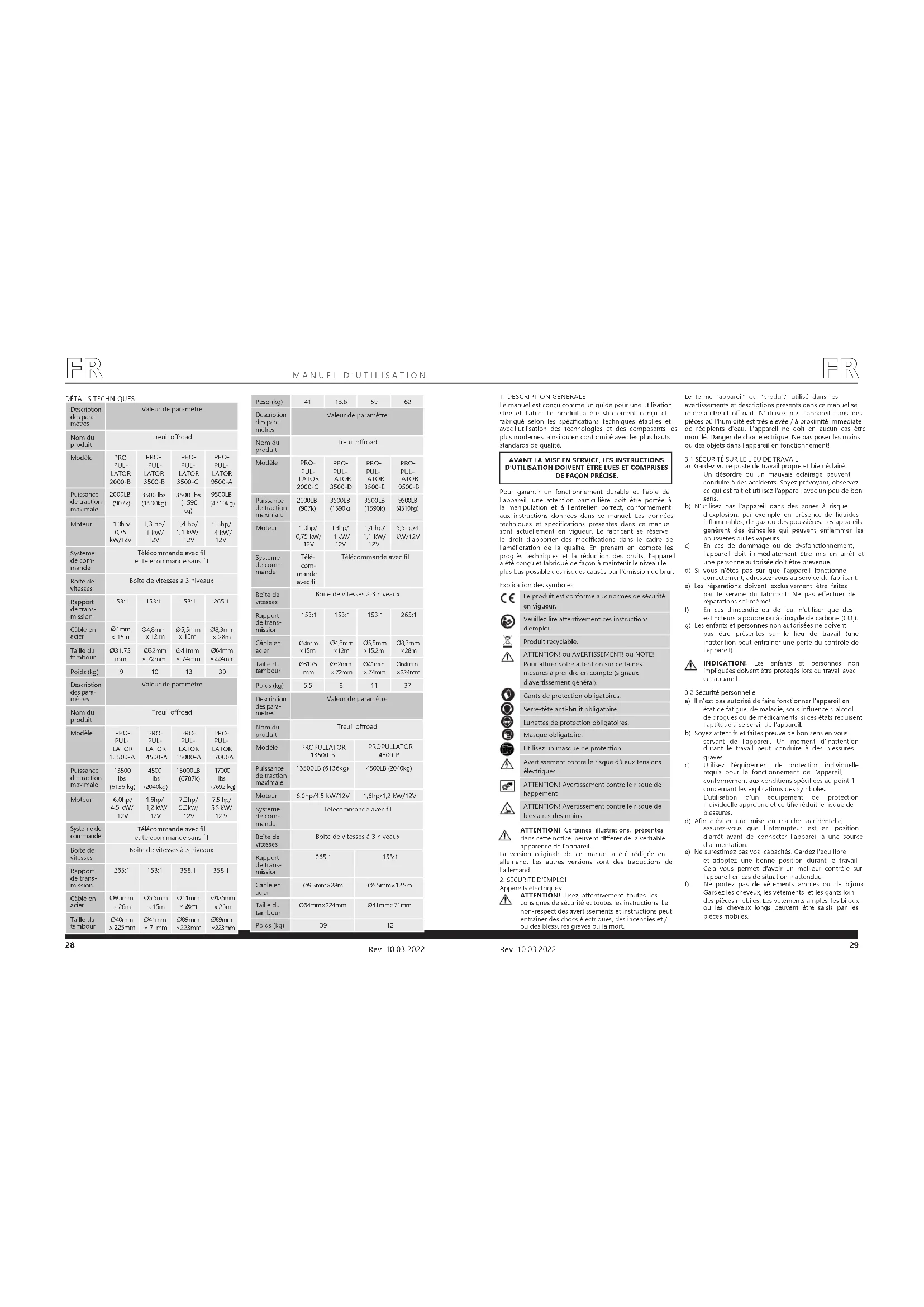Description des para- mètres Valeur de paramètre Nom du produit Treuil oroad Modèle PRO- PUL- LATOR 2000-C PRO- PUL- LATOR 3500-D PRO- PUL- LATOR 3500-E PRO- PUL- LATOR 9500-B Puissance de traction maximale 2000LB (907k) 3500LB (1590k) 3500LB (1590k) 9500LB (4310kg) Moteur 1,0hp/ 0,75 kW/ 12V 1,3hp/ 1 kW/ 12V 1,4 hp/ 1,1 kW/ 12V 5,5hp/4 kW/12V Systeme de com- mande Télé- com- mande avec l Télécommande avec l Boîte de vitesses Boîte de vitesses à 3 niveaux Rapport de trans- mission 153:1 153:1 153:1 265:1 Câble en acier Ø4mm ×15m Ø4,8mm ×12m Ø5,5mm ×15.2m Ø8,3mm ×28m Taille du tambour Ø31.75