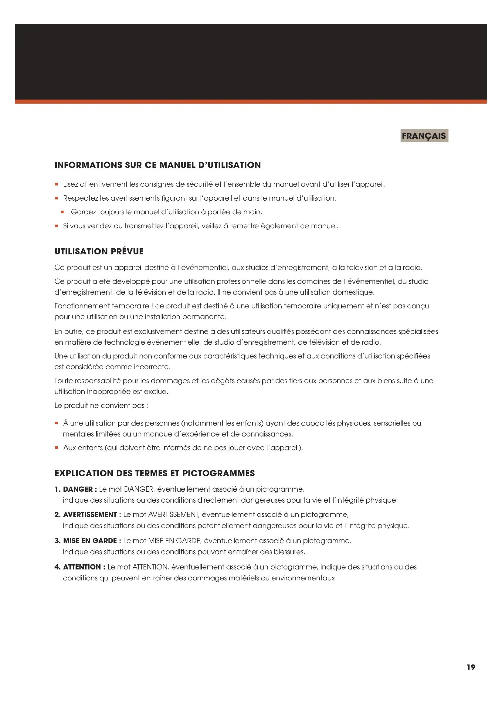 Ce produit est un appareil destiné à l’événementiel, aux studios d’enregistrement, à la télévision et à la radio. Ce produit a été développé pour une utilisation professionnelle dans les domaines de l’événementiel, du studio d’enregistrement, de la télévision et de la radio. Il ne convient pas à une utilisation domestique. Fonctionnement temporaire! ce produit est destiné à une utilisation temporaire uniquement et n’est pas conçu pour une utilisation ou une installation permanente. En outre, ce produit est exclusivement destiné à des utilisateurs qualifiés possédant des connaissances spécialisées en matière de technologie événementielle, de studio d’enregistrement, de télévision et de radio. Une utilisation du produit non conforme aux caractéristiques techniques et aux conditions d’utilisation spécifiées est considérée comme incorrecte. Toute responsabilité pour les dommages et les dégâts causés par des tiers aux personnes et aux biens suite à une utilisation inappropriée est exclue. Le produit ne convient pas: À une utilisation par des personnes (notamment les enfants) ayant des capacités physiques, sensorielles ou mentales limitées ou un manque d’expérience et de connaissances. Aux enfants (qui doivent être informés de ne pas jouer avec l’appareil).