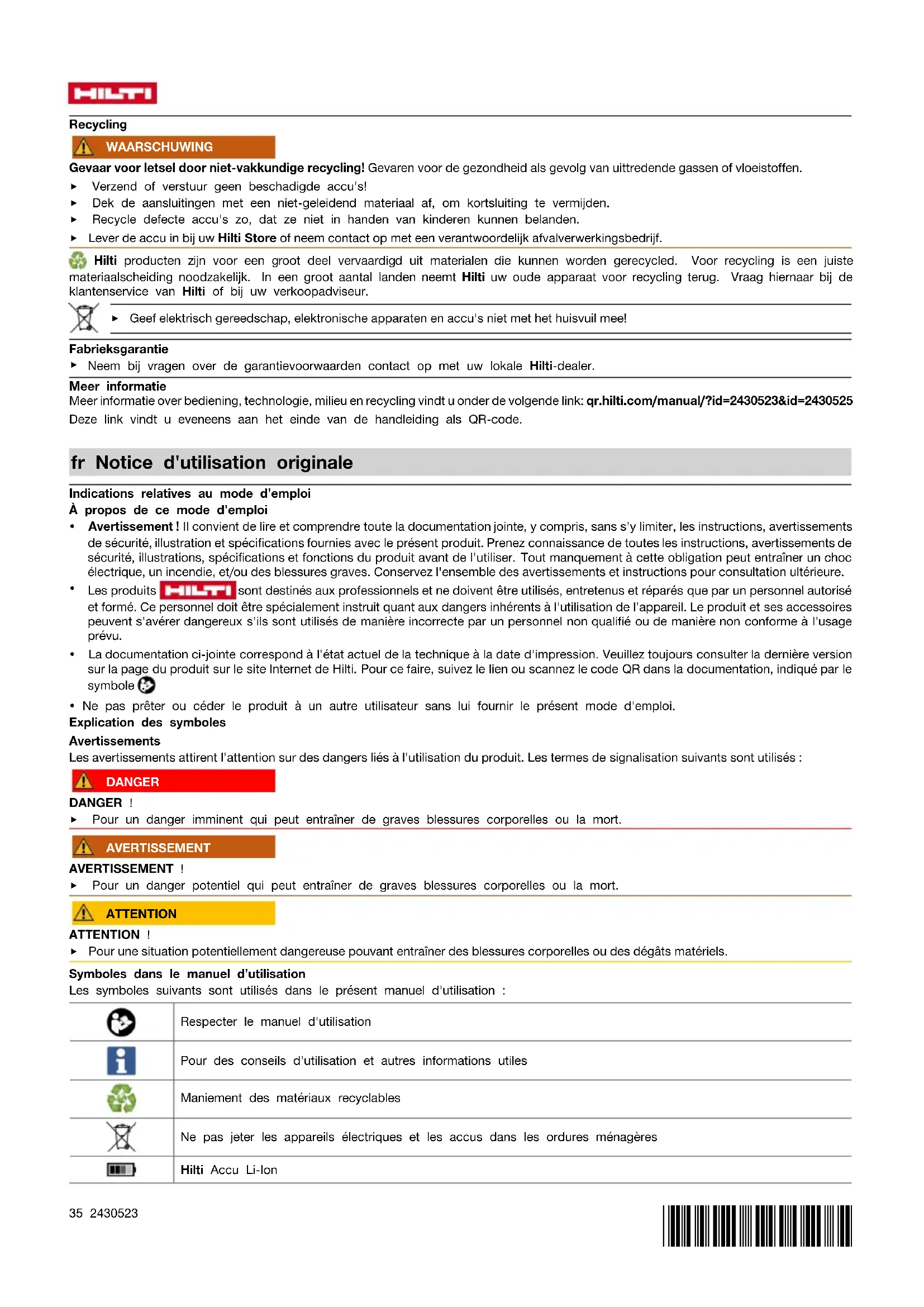 ▶ Ne jamais transporter les accus en vrac. Pendant le transport, les accus doivent être protégés des vibrations et chocs excessifs, isolés de tout matériau conducteur ou autre accu, pour éviter qu'ils n'entrent en contact avec d'autres pôles de batterie et qu'ils provoquent un court-circuit. Tenir compte des prescriptions locales pour le transport d'accus. ▶ Ne pas envoyer les accus par la poste. S'adresser à un service d'expédition s'il faut envoyer des accus non endommagés. ▶ Contrôler l'état du produit et des accus avant chaque utilisation, ainsi qu'avant et après tout transport prolongé. Stockage des outils sans fil et des accus AVERTISSEMENT Endommagement involontaire du fait d'accus défectueux ou de chute d'accu ! ▶ Toujours retirer les accus avant de stocker les produits ! ▶ Stocker si possible le produit et les accus dans un endroit sec et frais. Respecter les valeurs limites de température indiquées dans les caractéristiques techniques 41. ▶ Ne pas stocker les accus sur le chargeur. Retirer toujours l'accu du chargeur après la charge. ▶ Ne jamais stocker les accus exposés au soleil, sur des sources de chaleur ou derrière des vitres. ▶ Stocker le produit et les accus à l'abri des enfants et des personnes non autorisées. ▶ Contrôler l'état du produit et des accus avant chaque utilisation, ainsi qu'avant et après tout stockage prolongé. Aide au dépannage En cas de dysfonctionnements, tenir compte de l'indicateur d'état de l'accu et sur le panneau de commande. Voir chapitre Indicateurs de la batterie Li-Ion 41. En cas de défaillances non énumérées dans ce tableau ou auxquelles il n'est pas possible de remédier sans aide, contacter le S.A.V. Hilti. Défaillance Causes possibles Solution Les DEL de l'accu n'indiquent rien L'accu est défectueux. ▶ S'adresser au S.A.V. Hilti. L'accu se vide plus rapidement que d'habitude. Température ambiante très basse. ▶ Laisser l'accu se réchauffer lentement à la température de service. L'accu ne s'encliquette pas avec un clic audible. L'ergot d'encliquetage sur l'accu est encrassé. ▶ Nettoyer l'ergot d'encliquetage et réinsérer l'accu. Important dégagement de chaleur dans le produit ou dans l'accu. Défaut électrique. ▶ Arrêter immédiatement le produit, sortir l'accu et l'examiner, le laisser refroidir et contacter le S.A.V. Hilti. Recyclage AVERTISSEMENT Risque de blessures en cas d'élimination incorrecte ! Émanations possibles de gaz et de liquides nocives pour la santé. ▶ Ne pas envoyer ni expédier d'accus endommagés ! ▶ Recouvrir les raccordements avec un matériau non conducteur pour éviter tout court-circuit. ▶ Éliminer les accus en veillant à ce qu'ils soient hors de la portée des enfants. ▶ Éliminer l'accu en le déposant auprès du Hilti Store local ou s'adresser à l'entreprise de collecte des déchets compétente. Les produits Hilti sont fabriqués pour une grande partie en matériaux recyclables. Le recyclage présuppose un tri adéquat des matériaux. Hilti reprend les appareils usagés dans de nombreux pays en vue de leur recyclage. Consulter le service clients Hilti ou un conseiller commercial. ▶ Ne pas jeter les appareils électriques, électroniques et accus dans les ordures ménagères ! Garantie constructeur ▶ En cas de questions sur les conditions de garantie, veuillez vous adresser à votre partenaire Hilti local. Informations complémentaires Des informations complémentaires concernant l'utilisation, la technique, l'environnement et le recyclage sont disponibles sous le lien ci- dessous : qr.hilti.com/manual/?id=2430523&id=2430525 Ce lien figure également à la fin du mode d'emploi sous forme de code QR. es Manual de instrucciones original Información sobre el manual de instrucciones Acerca de este manual de instrucciones