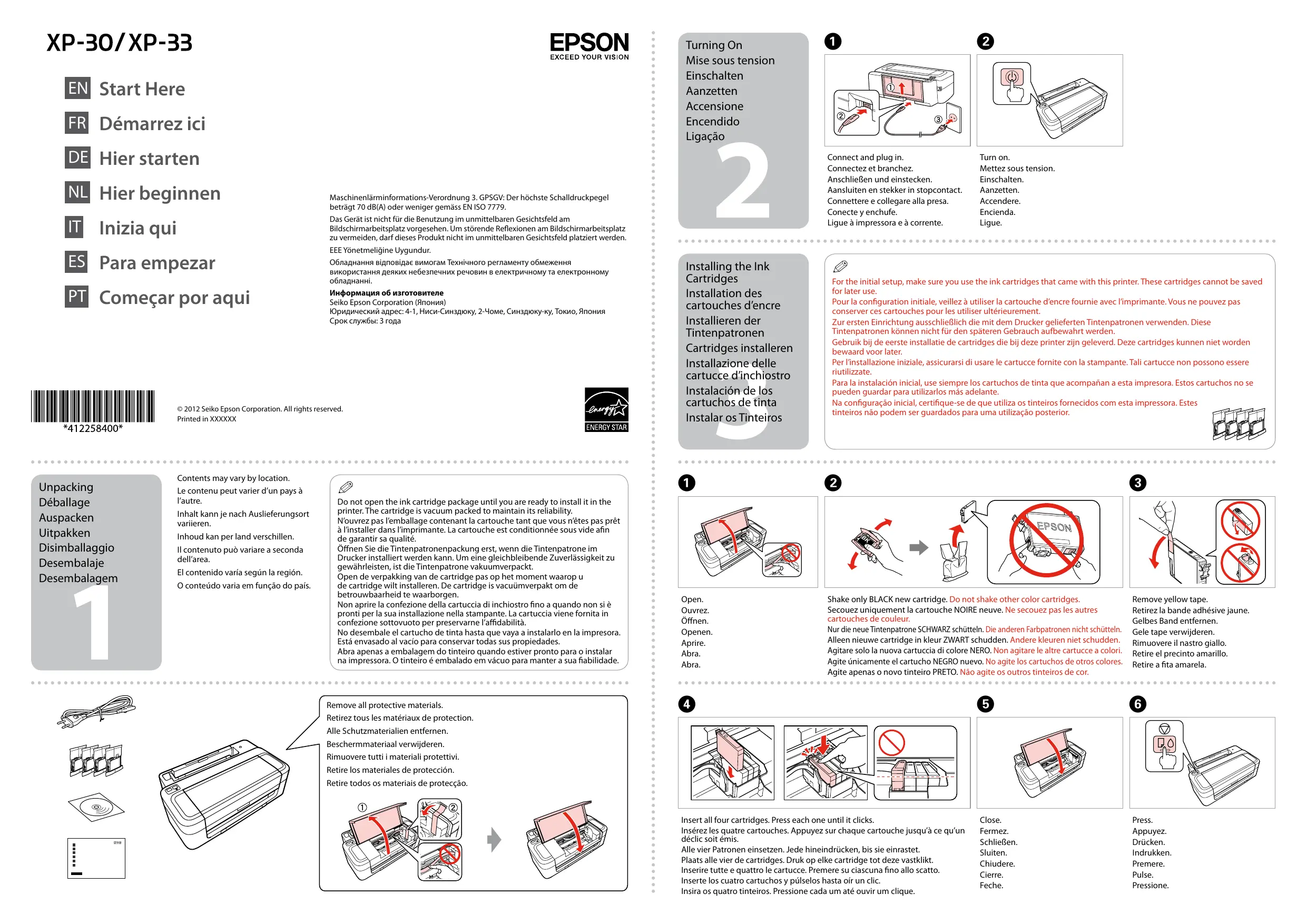 Turning On Mise sous tension Einschalten Aanzetten Accensione Open de verpakking van de cartridge pas op het moment waarop u de cartridge wilt installeren. De cartridge is vacuümverpakt om de betrouwbaarheid te waarborgen. Non aprire la confezione della cartuccia di inchiostro fino a quando non si è pronti per la sua installazione nella stampante. La cartuccia viene fornita in confezione sottovuoto per preservarne l’affidabilità. No desembale el cartucho de tinta hasta que vaya a instalarlo en la impresora. Está envasado al vacío para conservar todas sus propiedades. Abra apenas a embalagem do tinteiro quando estiver pronto para o instalar na impressora. O tinteiro é embalado em vácuo para manter a sua fiabilidade. No conecte el cable USB hasta que se le indique. Ligue apenas o cabo USB quando isso lhe for solicitado.