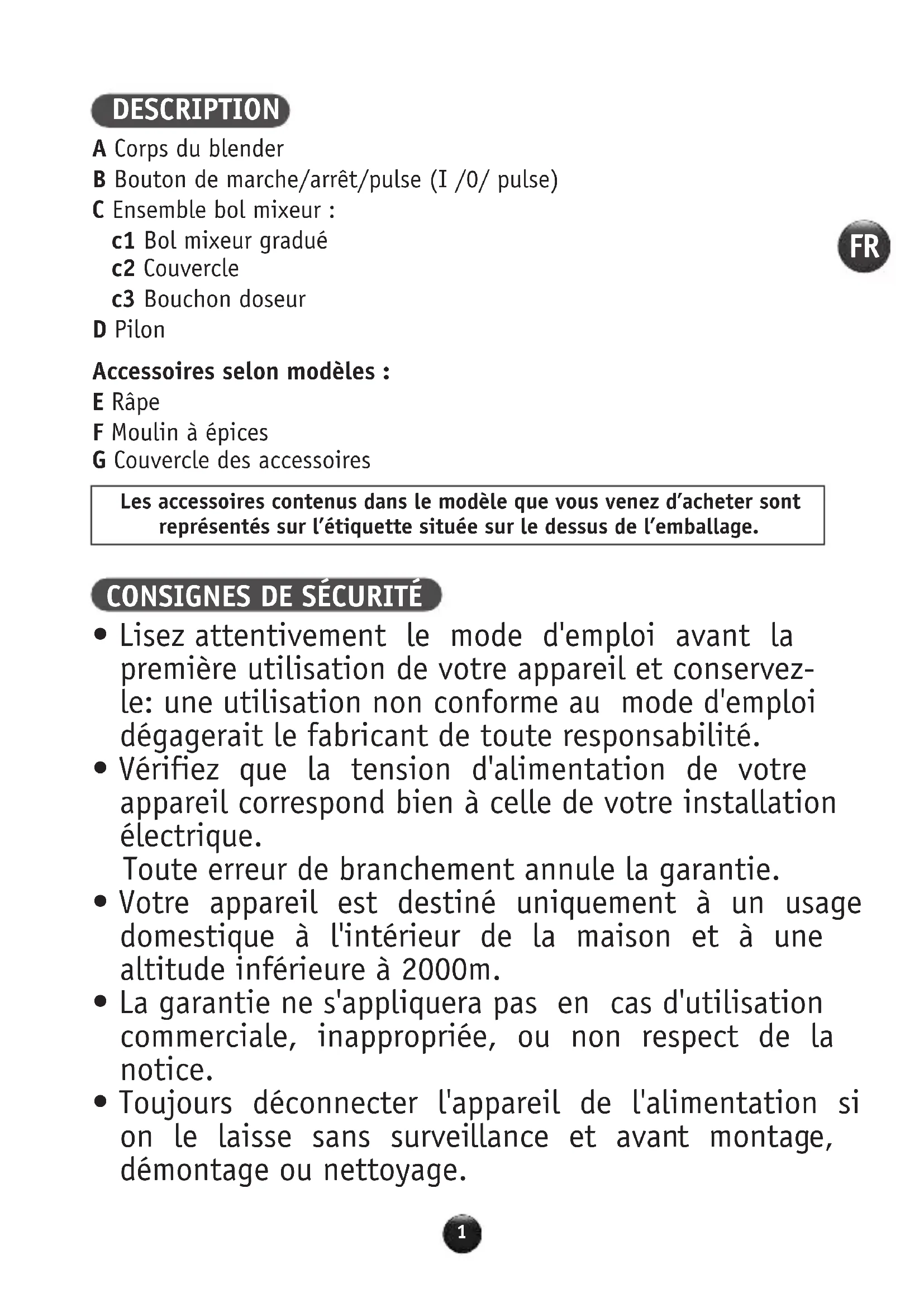 - Toujours déconnecter l'appareil de l'alimentation si on le laisse sans surveillance et avant montage, démontage ou nettoyage. A Corps du blender B Bouton de marche/arrêt/pulse (I /0/ pulse) C Ensemble bol mixeur : c1 Bol mixeur gradué c2 Couvercle c3 Bouchon doseur D Pilon Accessoires selon modèles : E Râpe F Moulin à épices G Couvercle des accessoires DESCRIPTION Les accessoires contenus dans le modèle que vous venez d’acheter sont représentés sur l’étiquette située sur le dessus de l’emballage.
