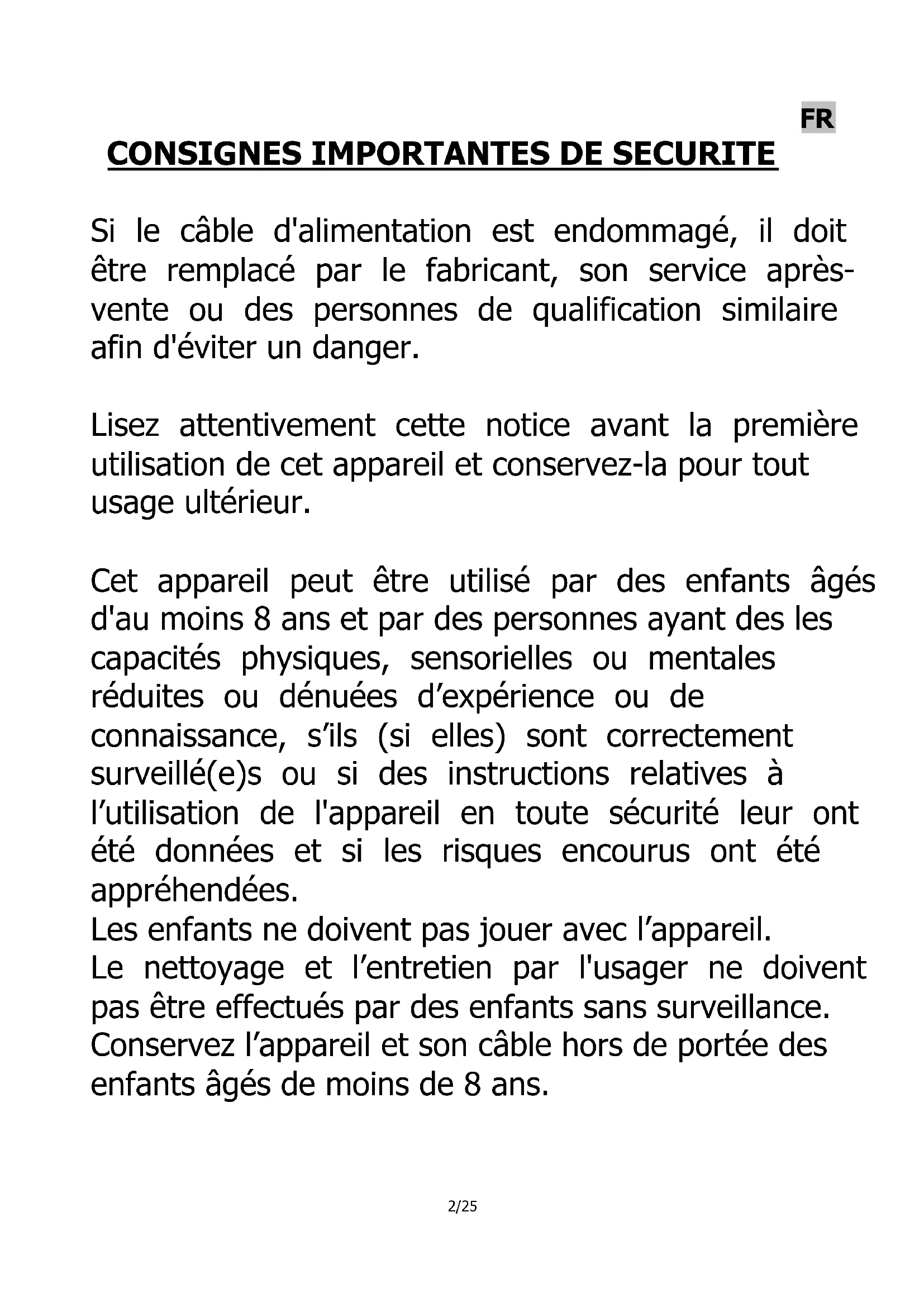 Si le câble d'alimentation est endommagé, il doit être remplacé par le fabricant, son service après- vente ou des personnes de qualification similaire afin d'éviter un danger. Lisez attentivement cette notice avant la première utilisation de cet appareil et conservez-la pour tout usage ultérieur. Cet appareil peut être utilisé par des enfants âgés d'au moins 8 ans et par des personnes ayant des les capacités physiques, sensorielles ou mentales réduites ou dénuées d’expérience ou de connaissance, s’ils (si elles) sont correctement surveillé(e)s ou si des instructions relatives à l’utilisation de l'appareil en toute sécurité leur ont été données et si les risques encourus ont été appréhendées. Les enfants ne doivent pas jouer avec l’appareil. Le nettoyage et l’entretien par l'usager ne doivent pas être effectués par des enfants sans surveillance. Conservez l’appareil et son câble hors de portée des enfants âgés de moins de 8 ans.3/25 L’appareil doit être alimenté uniquement sous la très basse tension de sécurité correspondant au marquage de l’appareil.