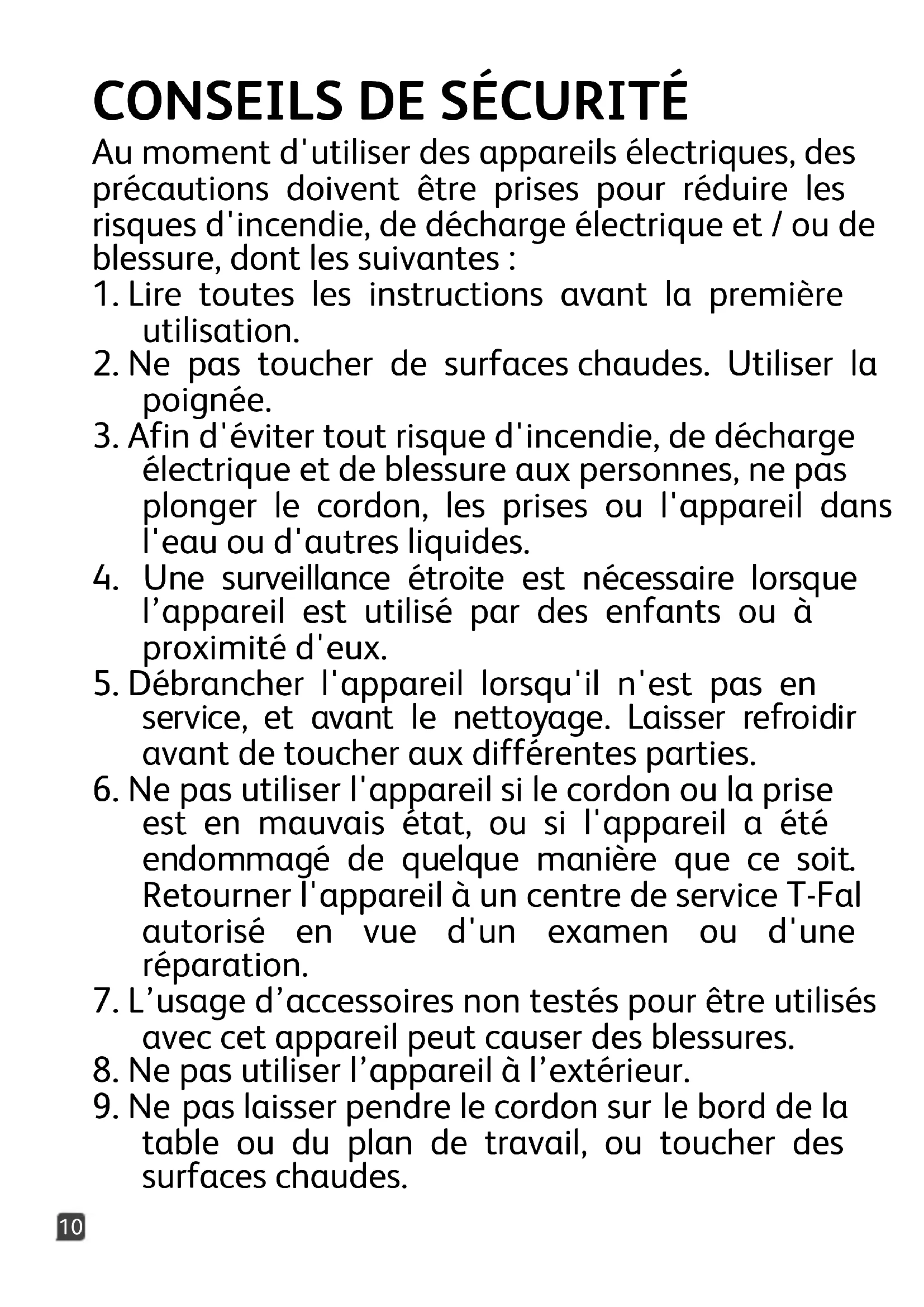 ATTENTION Cet appareil est conçu pour une utilisation domestique seulement. Tout entretienautre que le nettoyage et le détartrage effectués en conformité avec les instructionsdoit être fait par le personnel d’un centre de service agréé T-fal. Visiter notre site Webwww.t-fal.caau Canada ou communiquer avec le service à la clientèle pour obtenir lescoordonnées du centre de service le plus près de chez vous. Afin de réduire les risquesd’incendie et de décharge électrique, ne pas démonter l’appareil. Toute réparationdoit être effectuée par le personnel d’un centre de service agréé T-fal uniquement.