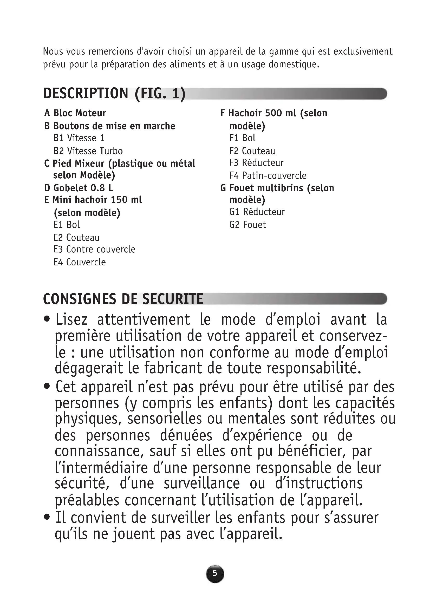 - Il convient de surveiller les enfants pour s’assurer qu’ils ne jouent pas avec l’appareil. A Bloc Moteur B Boutons de mise en marche B1 Vitesse 1 B2 Vitesse Turbo C Pied Mixeur (plastique ou métal selon Modèle) D Gobelet 0.8 L E Mini hachoir 150 ml (selon modèle) E1 Bol E2 Couteau E3 Contre couvercle E4 Couvercle F Hachoir 500 ml (selon modèle) F1 Bol F2 Couteau F3 Réducteur F4 Patin-couvercle G Fouet multibrins (selon modèle) G1 Réducteur G2 Fouet6