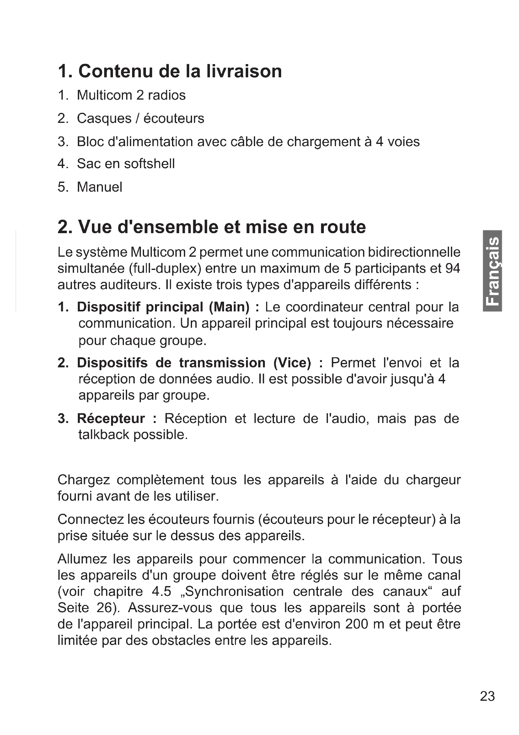 talkback possible. Chargez complètement tous les appareils à l'aide du chargeur fourni avant de les utiliser. Connectez les écouteurs fournis (écouteurs pour le récepteur) à la prise située sur le dessus des appareils. Allumez les appareils pour commencer la communication. Tous les appareils d'un groupe doivent être réglés sur le même canal (voir chapitre 4.5 „Synchronisation centrale des canaux“ auf Seite 26). Assurez-vous que tous les appareils sont à portée de l'appareil principal. La portée est d'environ 200 m et peut être limitée par des obstacles entre les appareils.24 Français