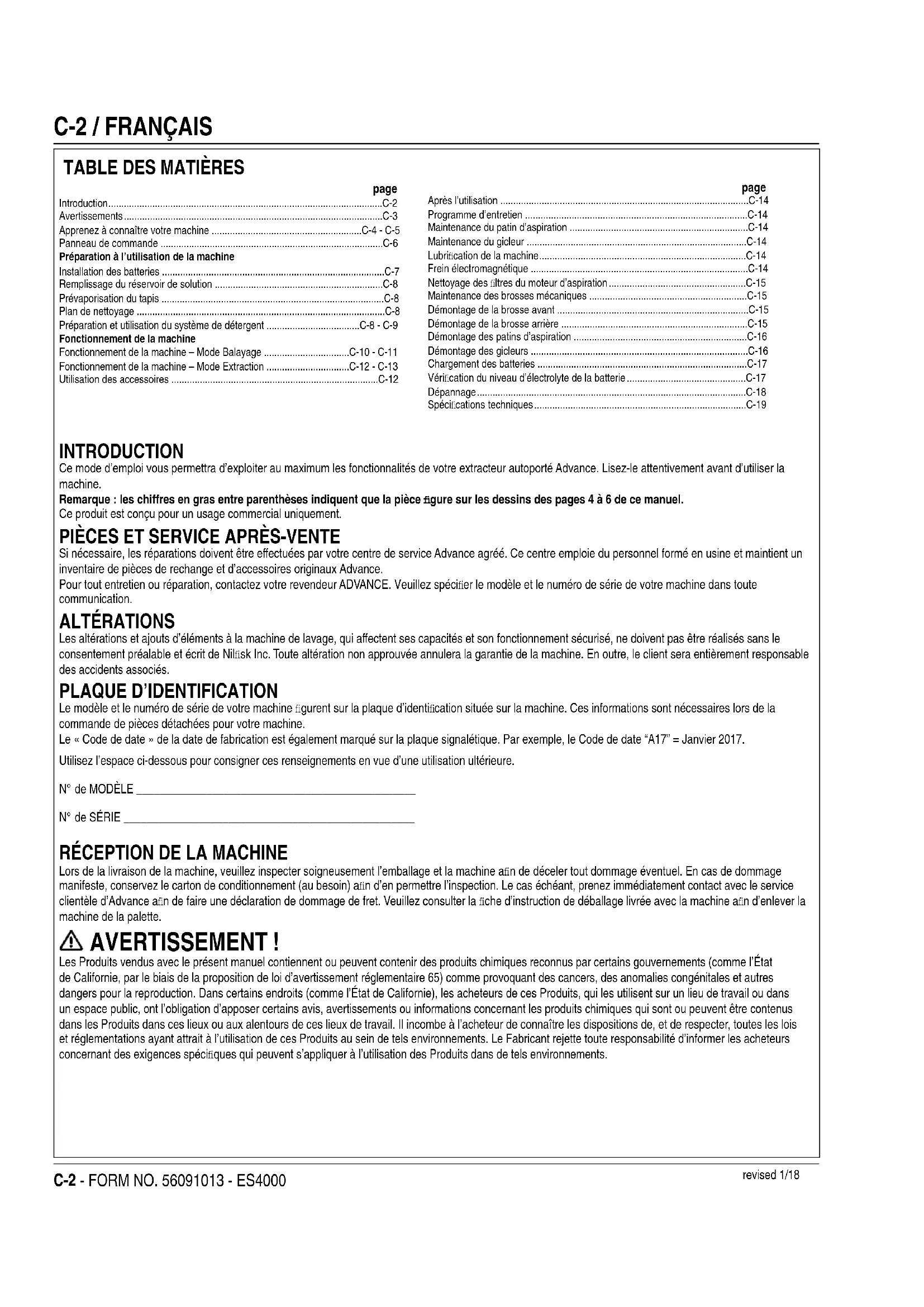 Si nécessaire, les réparations doivent être effectuées par votre centre de service Advance agréé. Ce centre emploie du personnel formé en usine et maintient un inventaire de pièces de rechange et d’accessoires originaux Advance. Pour tout entretien ou réparation, contactez votre revendeur ADVANCE. Veuillez spécifi er le modèle et le numéro de série de votre machine dans toute communication. ALTÉRATIONS Les altérations et ajouts d’éléments à la machine de lavage, qui affectent ses capacités et son fonctionnement sécurisé, ne doivent pas être réalisés sans le consentement préalable et écrit de Nilfi sk Inc. Toute altération non approuvée annulera la garantie de la machine. En outre, le client sera entièrement responsable des accidents associés.