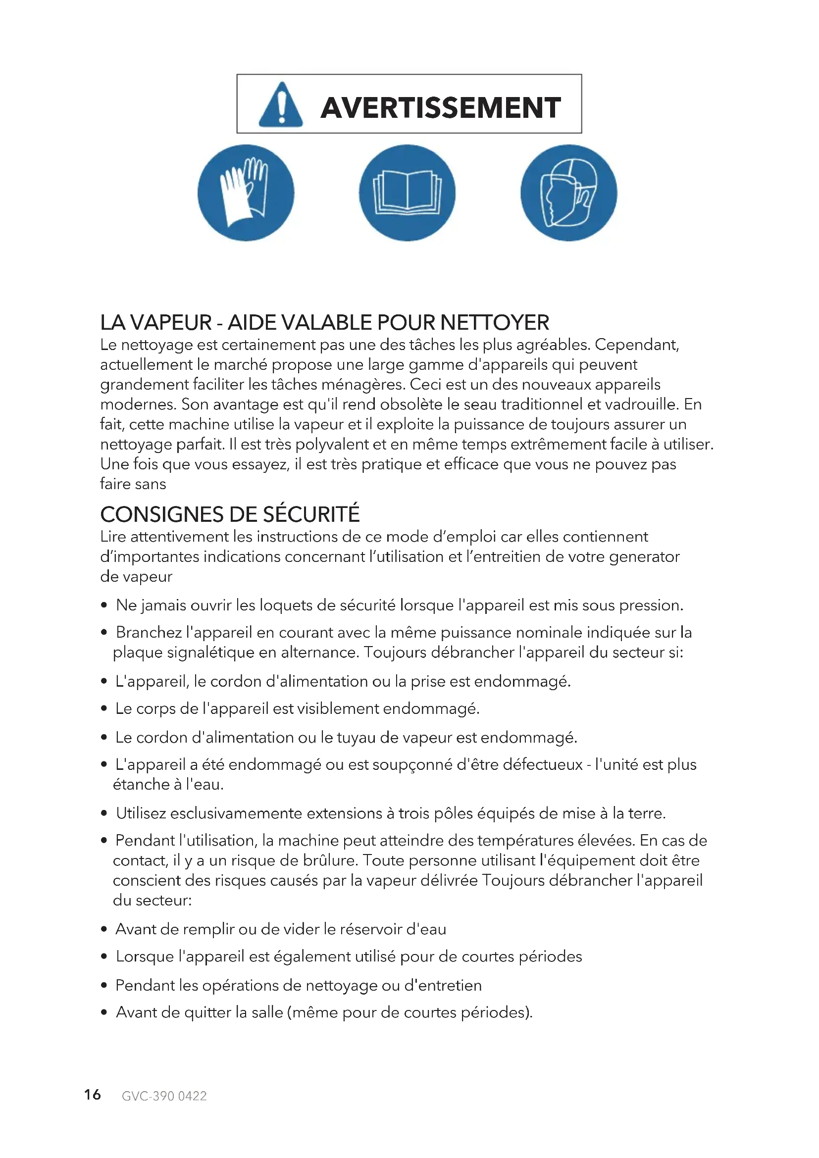 - Lorsque vous versez de l'eau dans l'appareil retirez la che de la prise.GVC-390 0422