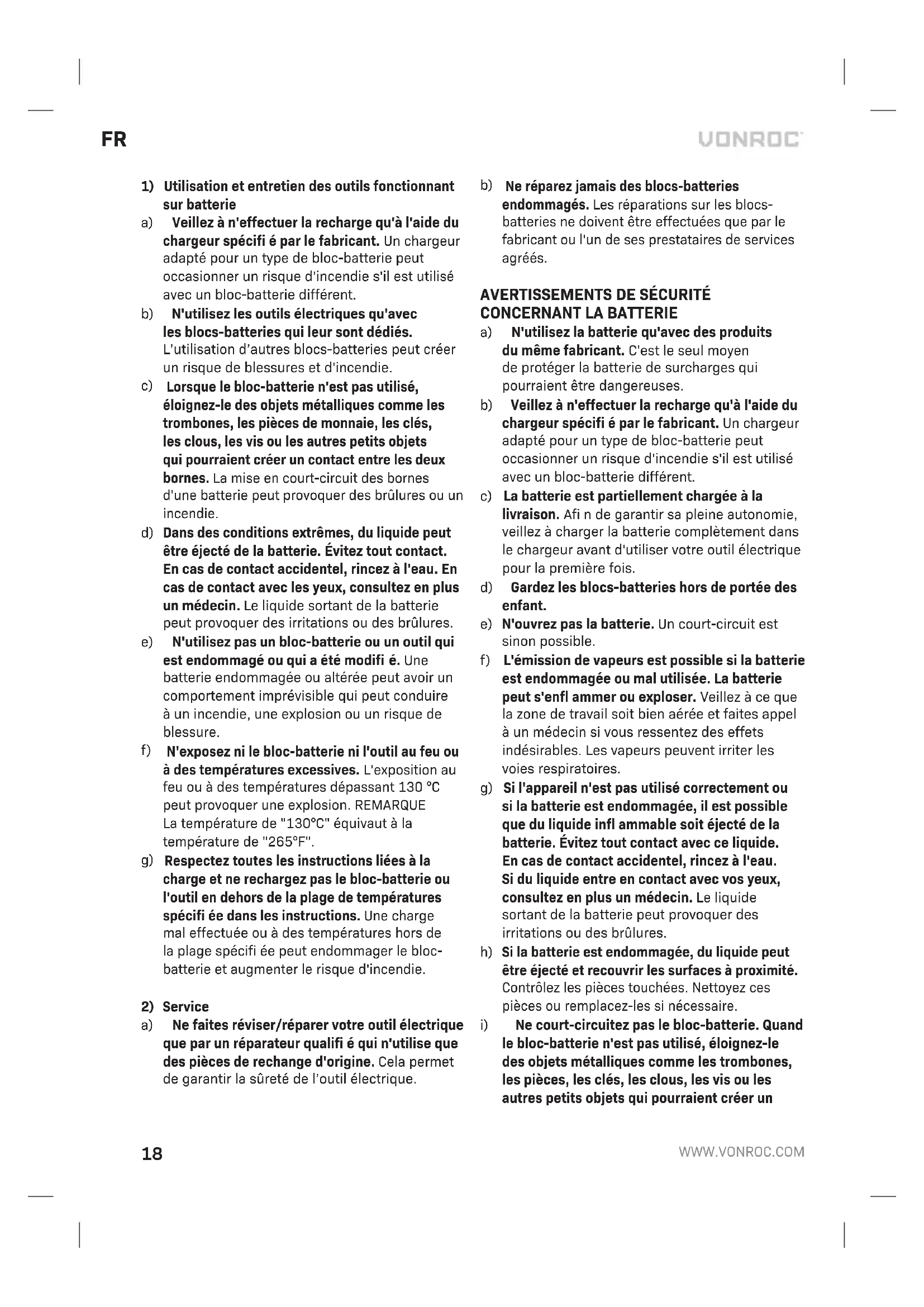 Avant toute opération de nettoyage ou de maintenance, éteignez toujours la machine et retirez-en le bloc-batterie. Nettoyez régulièrement le boîtier de la batterie à l'aide d'un chiffon doux et de préférence après chaque utilisation. Assurez-vous que les aérations restent exemptes de poussière et de saletés. Supprimez les taches tenaces à l'aide d'un chiffon doux légèrement humidifi é avec une solution savonneuse. N'utilisez aucun solvant, essence, alcool, ammoniaque, etc. car ces produits chimiques peuvent endommager les composants synthétiques. ENVIRONNEMENT Le symbole de la poubelle sur roulettes barrée indique que ce produit ne doit pas être jeté avec les déchets ménagers. Les équipements électriques et électroniques qui ne font pas l'objet d'un tri sélectif peuvent être dangereux pour l'environnement et la santé car ils contiennent des substances dangereuses. Veillez à les éliminer de façon responsable dans une déchetterie ou auprès d'une société de recyclage autorisées. Pour les pays de la Communauté Européenne uniquement Ne pas jeter les outils électriques avec les déchets ménagers. Conformément à la Directive Européenne 2012/19/CE relative à l'élimination des déchets électriques et électroniques et sa transposition dans la législation nationale, les outils électriques inutilisables doivent être collectés séparément et être jetés de façon écologique. GARANTIE Les produits VONROC sont développés avec les normes de qualité les plus hautes et ils sont garantis pour être exempts de défaut de pièces et de main d'œuvre pour la durée stipulée par la loi et à compter de la date d'achat initiale. Si, au cours de cette période, le produit devait rencontrer une quelconque panne due à un défaut de pièce ou de main d'œuvre, contactez VONROC directement. Les conditions suivantes sont exclues de la garantie :