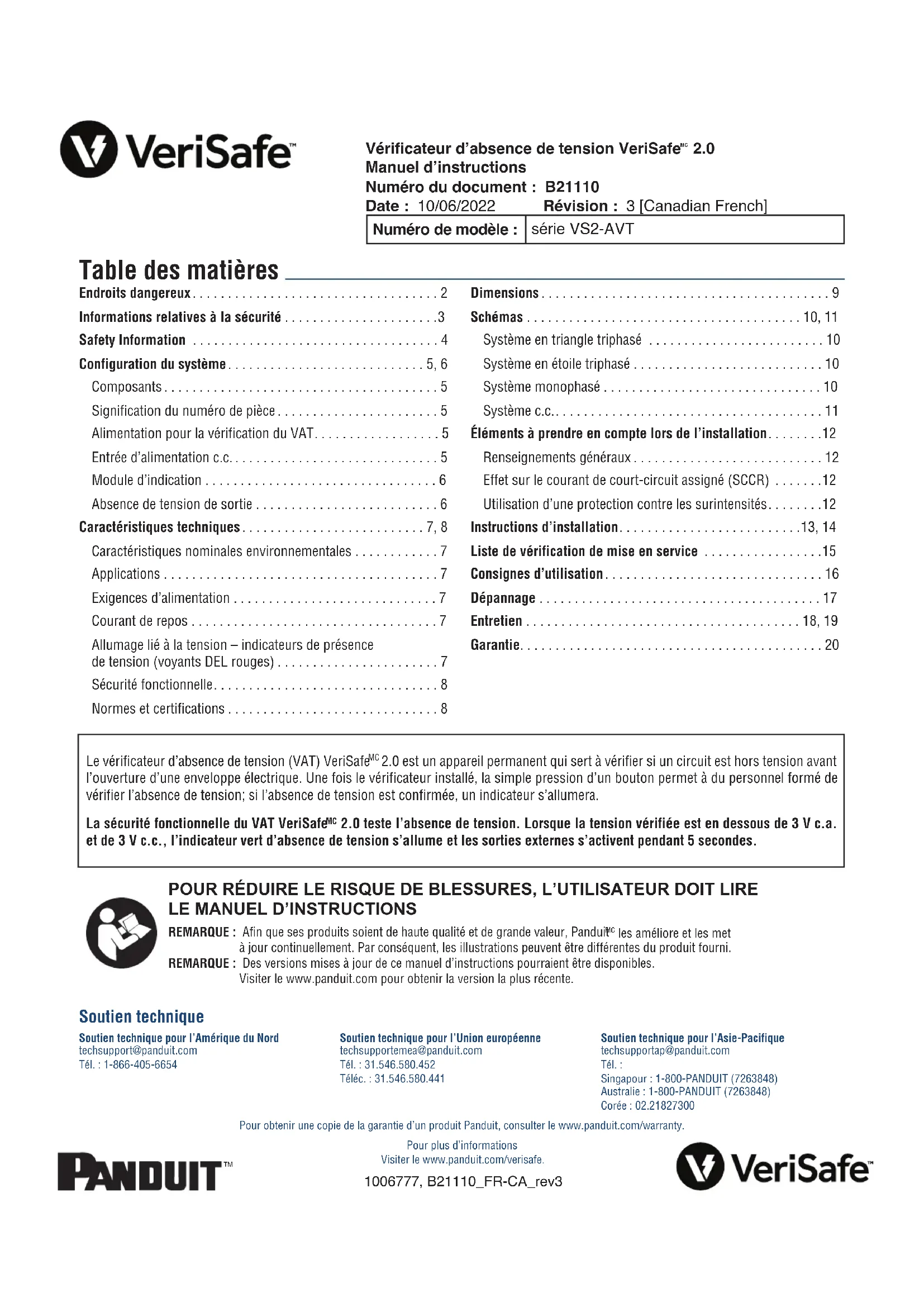 - Pour obtenir une copie de la garantie d’un produit Panduit, consulter le www.panduit.com/warranty.Pour plus d’informations Visiter le www.panduit.com/verisafe. 1006777, B21110_FR-CA_rev3 Soutien technique pour l’Amérique du Nord techsupport@panduit.com Tél. : 1-866-405-6654 Soutien technique pour l’Union européenne techsupportemea@panduit.com Tél. : 31.546.580.452 Téléc. : 31.546.580.441Soutien technique pour l’Asie-Pacifique techsupportap@panduit.com Tél. : Singapour : 1-800-PANDUIT (7263848) Australie : 1-800-PANDUIT (7263848) Corée : 02.21827300 Soutien technique Endroits dangereux p. 2