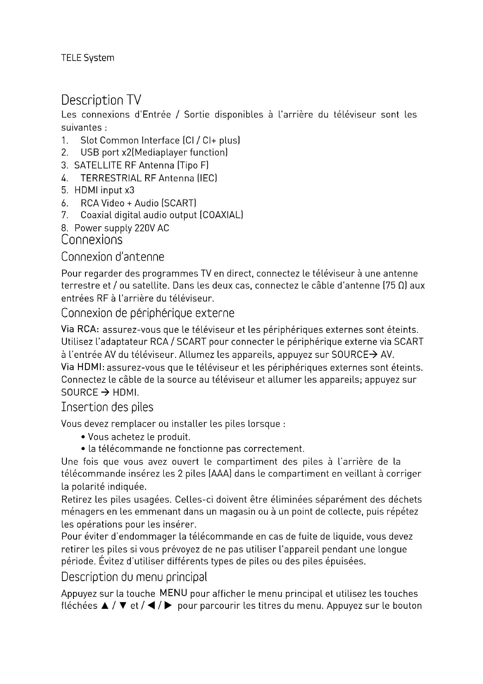 Connexions Connexion d'antenne Pour regarder des programmes TV en direct, connectez le téléviseur à une antenne terrestre et / ou satellite. Dans les deux cas, connectez le câble d'antenne (75 Ω) aux entrées RF à l'arrière du téléviseur. Connexion de périphérique externe Via RCA: assurez-vous que le téléviseur et les périphériques externes sont éteints. Utilisez l’adaptateur RCA / SCART pour connecter le périphérique externe via SCART à l’entrée AV du téléviseur. Allumez les appareils, appuyez sur SOURCEà AV. Via HDMI: assurez-vous que le téléviseur et les périphériques externes sont éteints. Connectez le câble de la source au téléviseur et allumer les appareils; appuyez sur SOURCE à HDMI. Insertion des piles Vous devez remplacer ou installer les piles lorsque :