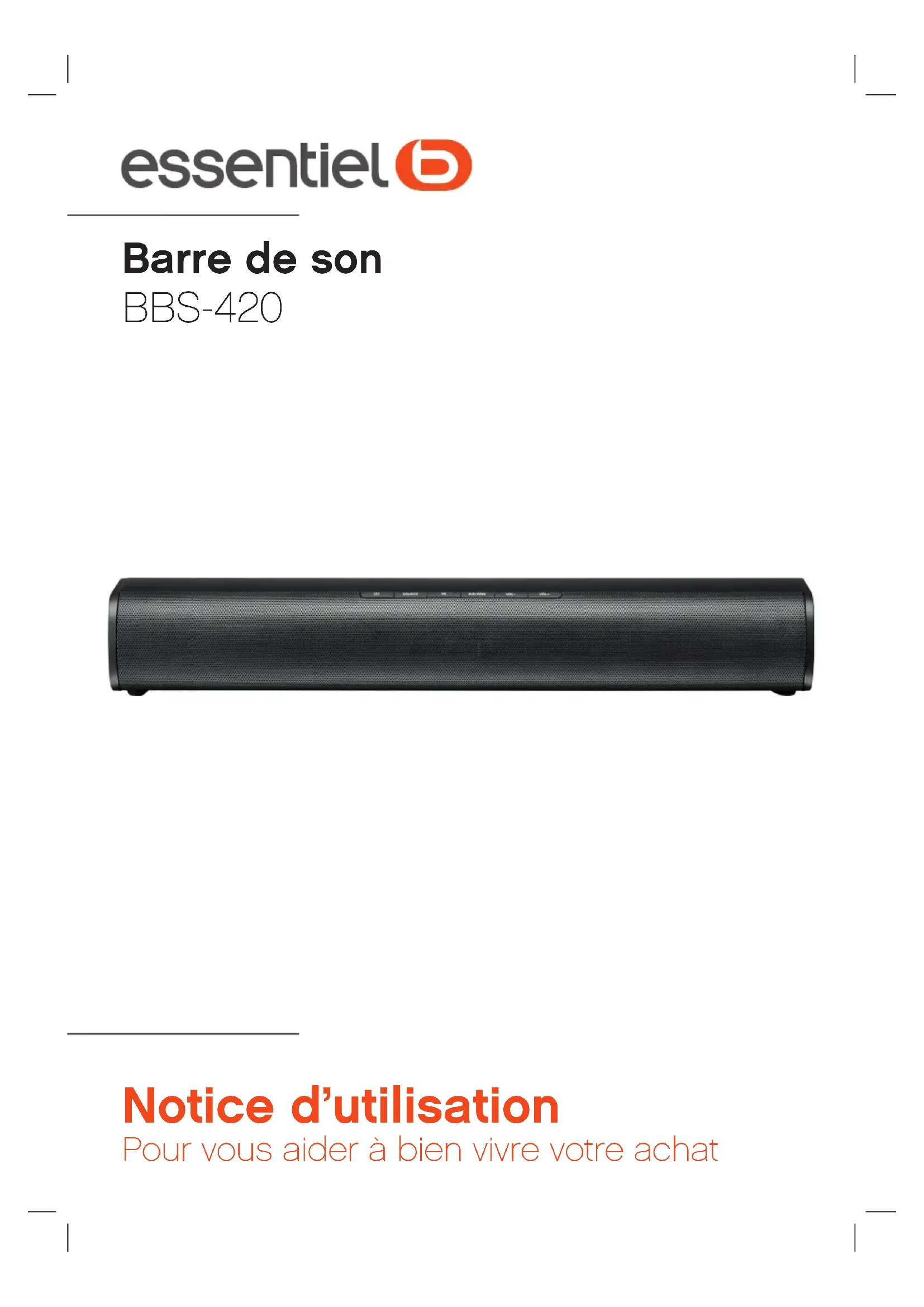 Barre de son BBS-420 Notice d’utilisation Pour vous aider à bien vivre votre achatVous venez d’acquérir un produit de la marque Essentiel b et nous vous en remercions. Nous apportons un soin tout particulier au DESIGN, à la FIABILITÉ et à la FACILITÉ D’USAGE de nos produits. Nous espérons que cette barre de son vous donnera entière satisfaction.sommaire votre produit 6 Contenu de la boîte 6 Caractéristiques techniques 6 Description de votre produit 7 FACE AVANT 7