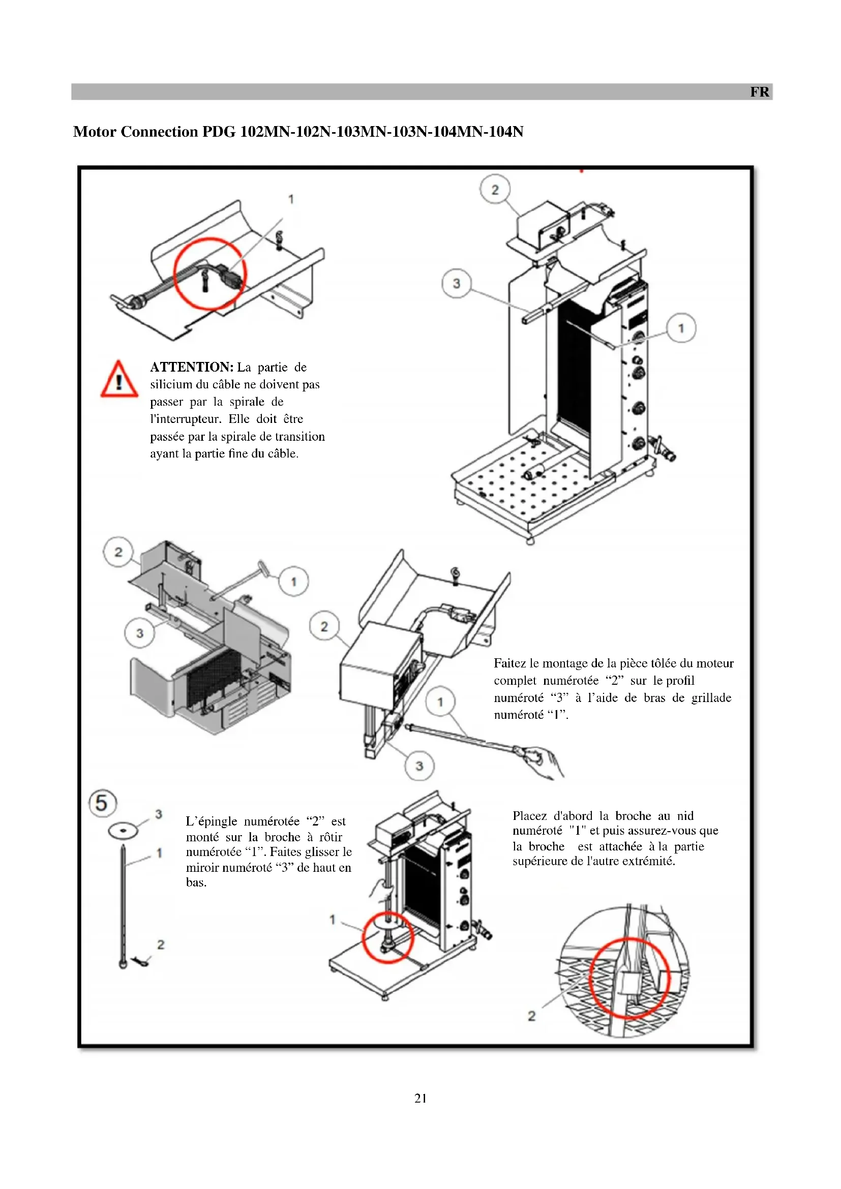 Motor Connection PDG 102MN-102N-103MN-103N-104MN-104N ATTENTION: La partie de silicium du câble ne doivent pas passer par la spirale de l'interrupteur. Elle doit être passée par la spirale de transition ayant la partie fine du câble. Faitez le montage de la pièce tôlée du moteur complet numérotée “2” sur le profil numéroté “3” à l’aide de bras de grillade numéroté “1”. L’épingle numérotée “2” est monté sur la broche à rôtir numérotée “1”. Faites glisser le miroir numéroté “3” de haut en bas. Placez d'abord la broche au nid numéroté "1" et puis assurez-vous que la broche est attachée à la partie supérieure de l'autre extrémité.22 Motor Connection PDG PDG 112MN-113MN-114MN Le fabricant décline toute responsabilité pour des opérations effectuées sans respecter les instructions du manuel d'utilisation, ni pour les dommages finaux causés sur les hommes ou les objets suite à l'entretien ou aux interventions techniques par des techniciens compétents.
