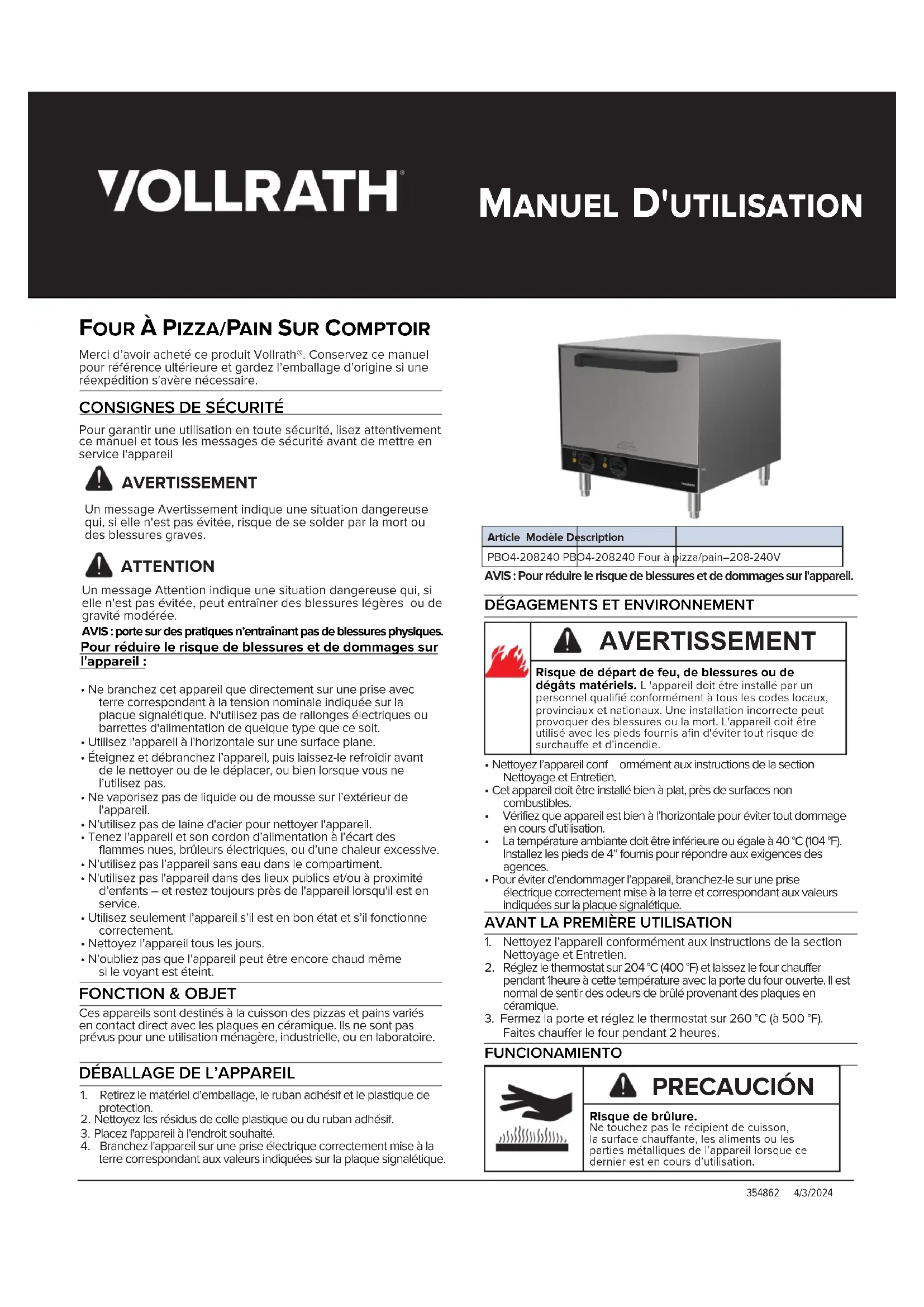 PBO4208240 - Four à pizza Vollrath - Notice d'utilisation et mode d'emploi gratuit